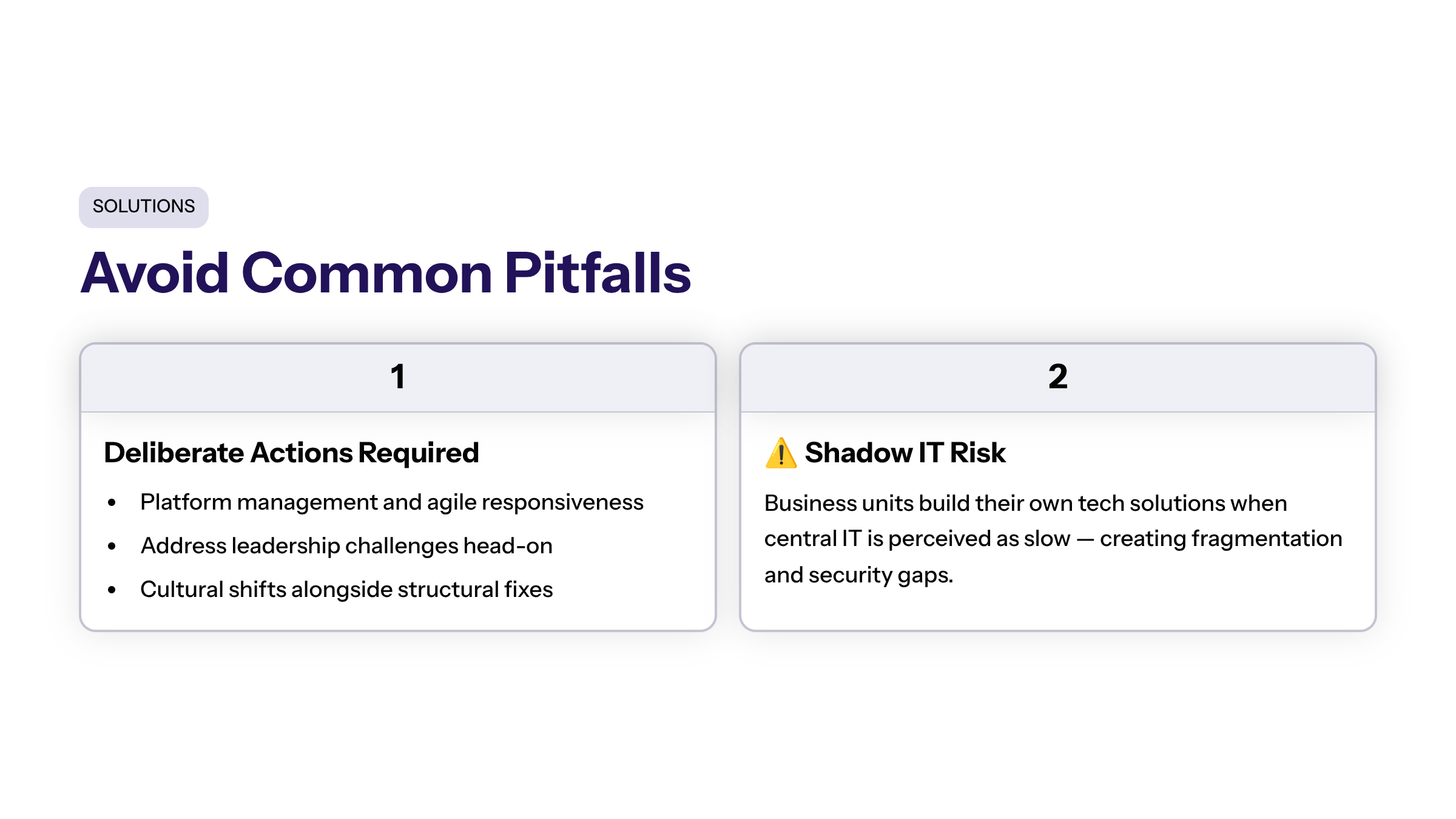 A common risk is the emergence of Shadow IT, where business units develop their own tech solutions due to perceived inefficiency or slow response from central IT.