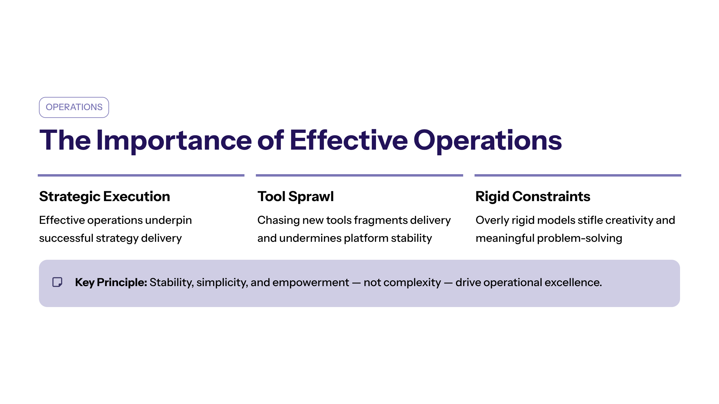 Effective operations underpin the successful execution of strategy. Chasing new tools in software development can introduce fragmentation and complexity, which slows down delivery and undermines platform stability.