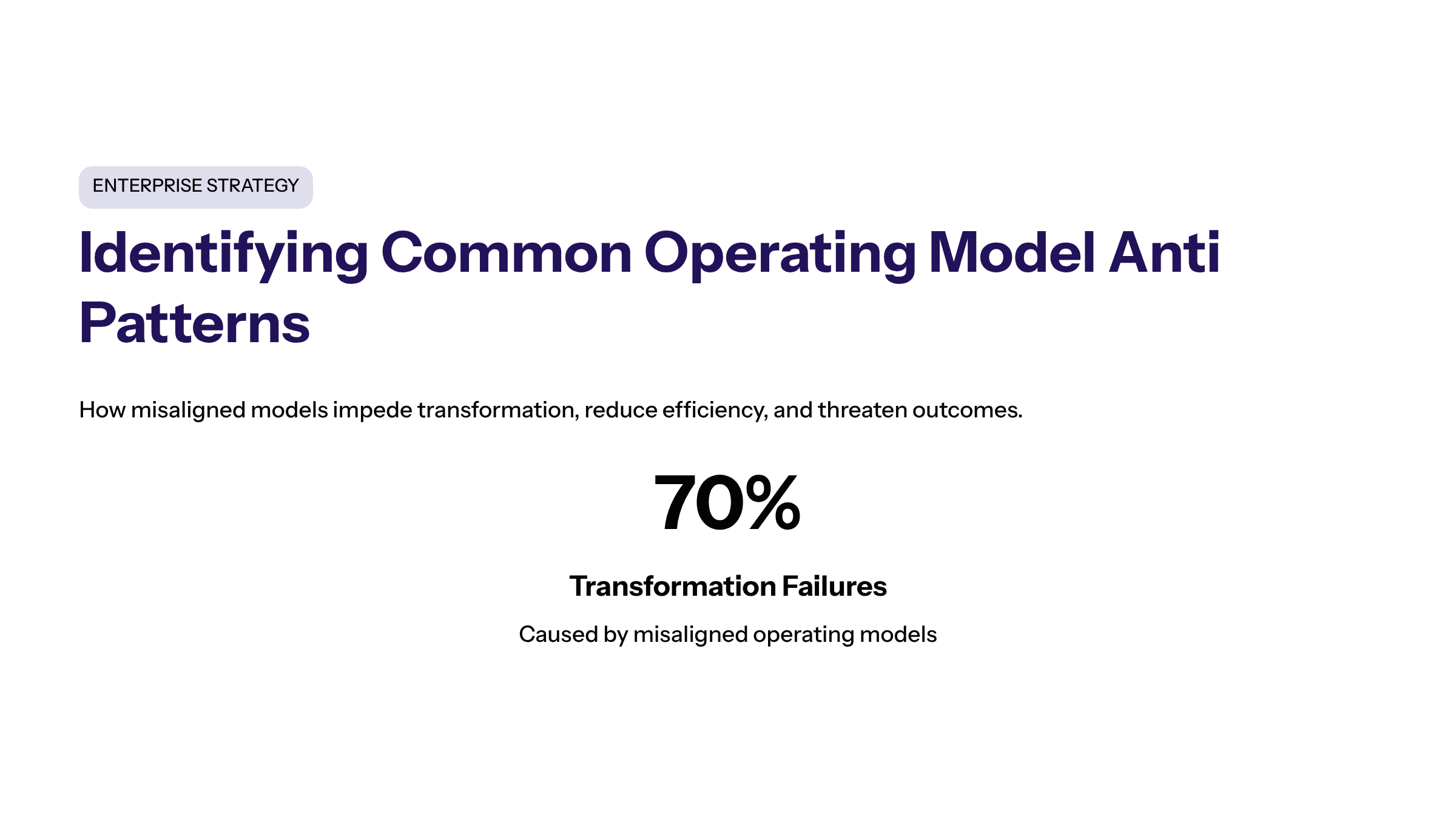 In today’s rapidly evolving business landscape, operating models serve as the backbone for organizational success, defining how companies deliver value and achieve strategic objectives. Misaligned operating models are estimated to cause up to 70% of organizational transformation failures. However, many enterprises encounter common operating model anti patterns that impede transformation efforts, reduce efficiency, and threaten business outcomes.