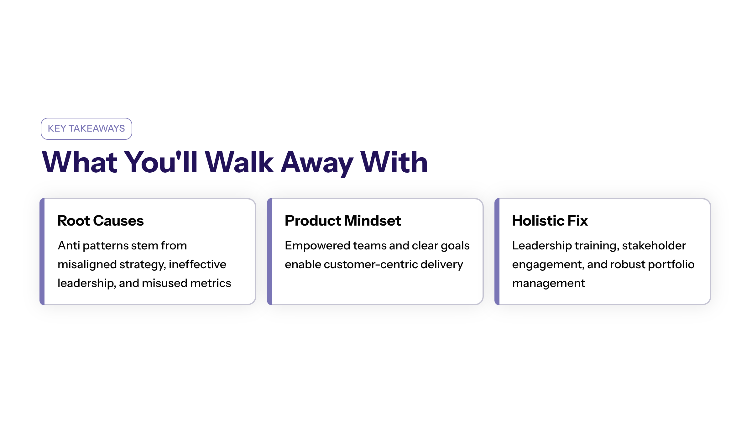 Investing in training programs to train teams equips product managers and teams with the skills required for discovery, agile delivery, and stakeholder management. Conducting periodic diagnostics can uncover hidden bottlenecks in resource utilization and process complexity. Awareness initiatives help identify anti patterns early and promote a culture of continuous improvement.