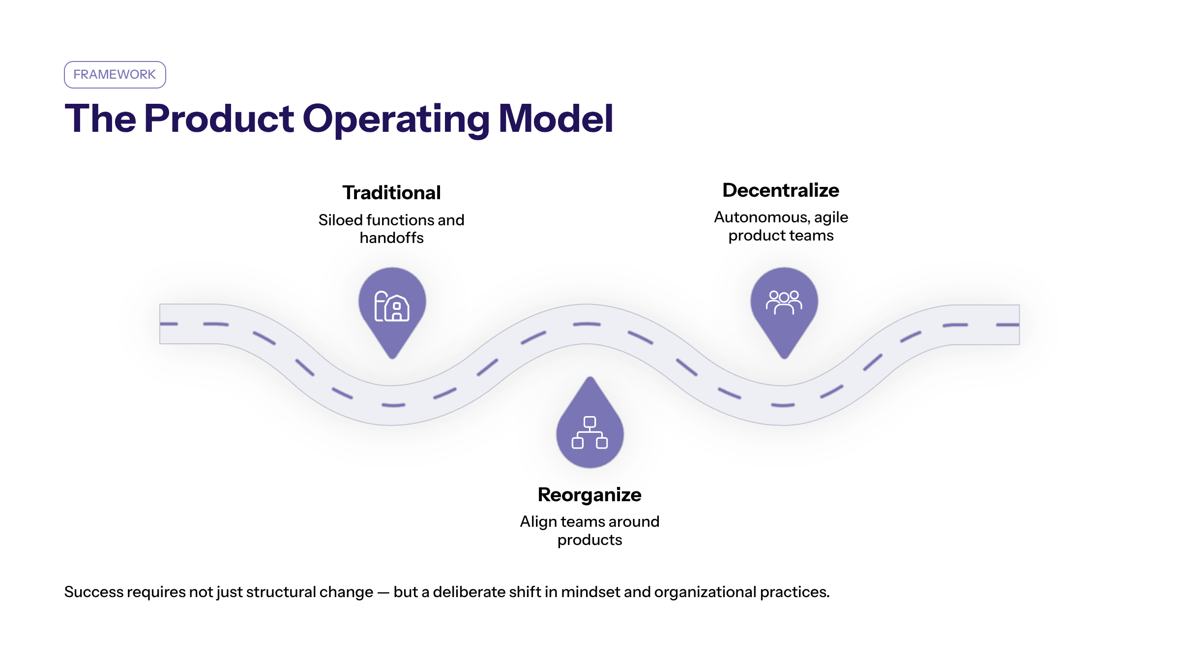 This transition involves not only structural changes but also a deliberate shift in mindset and organizational practices to fully realize the benefits of the product model. It integrates product vision, strategy, and execution, emphasizing autonomy balanced with alignment to strategic objectives.