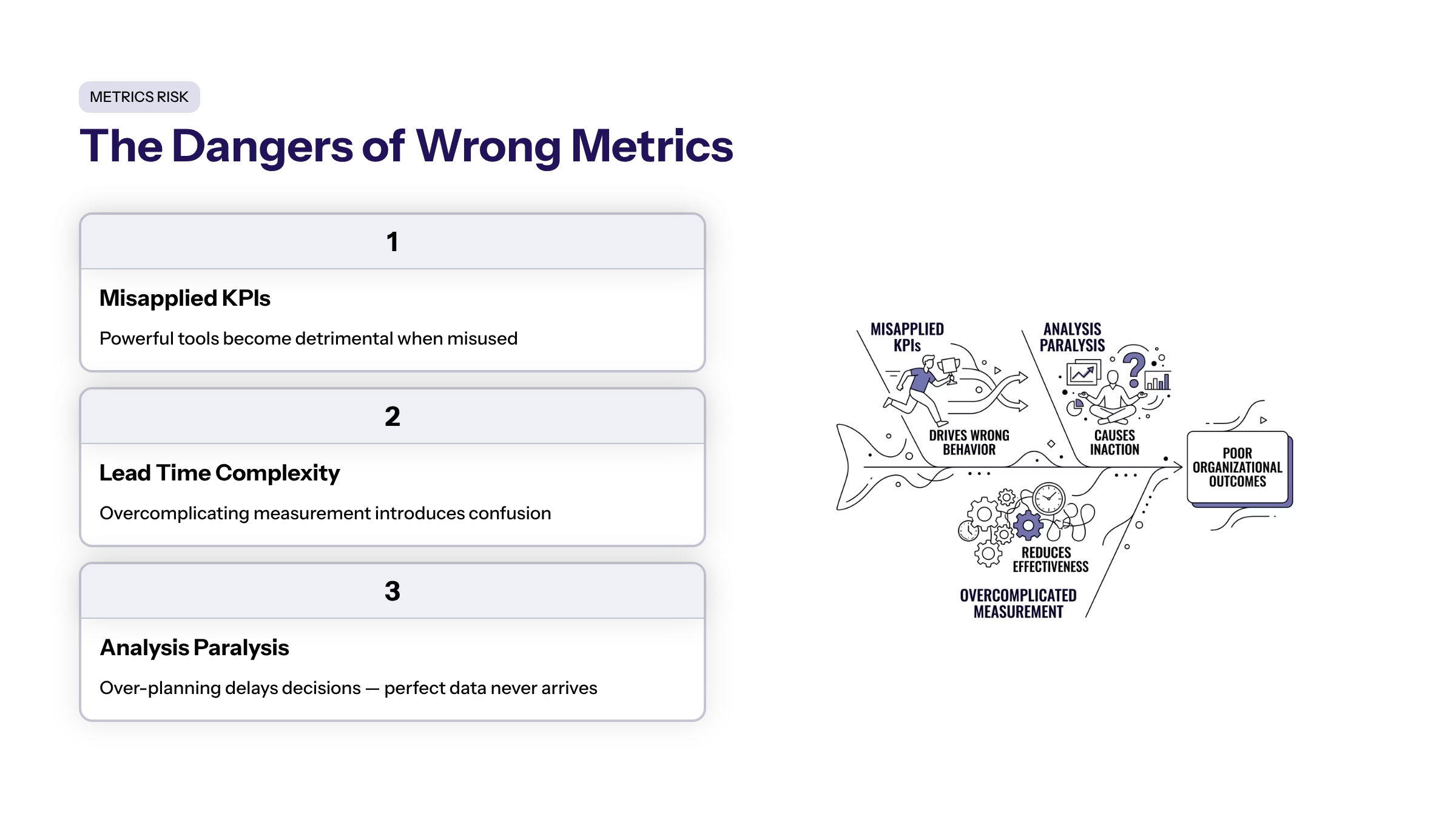 Many organizations rely on metrics that do not accurately reflect value creation, such as focusing on output quantity over quality or customer impact. Metrics, particularly those used to micromanage, can reduce team morale and creativity. Vanity metrics—like website traffic or number of features delivered without context—can create a false sense of progress and misdirect resources.