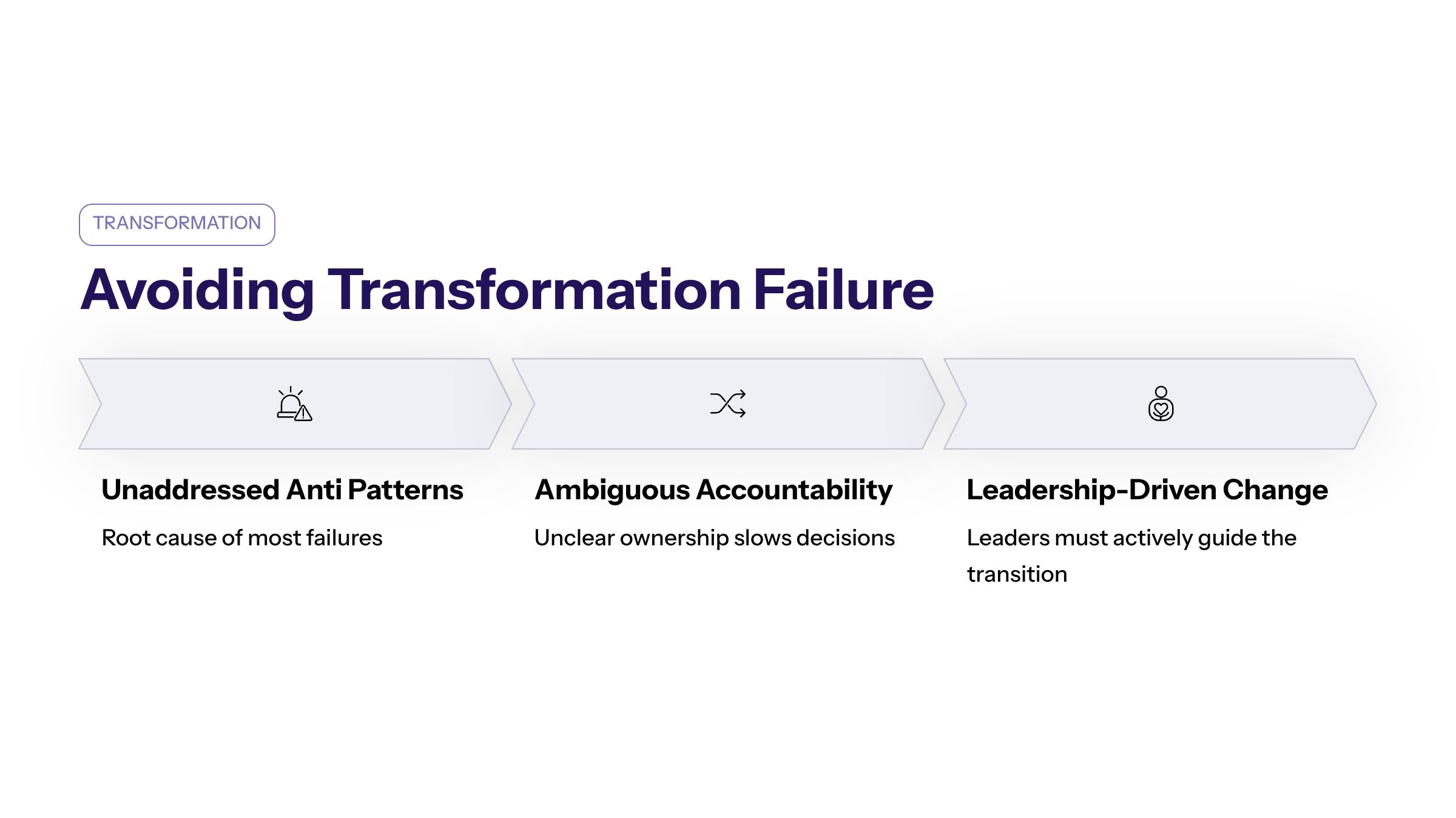 Transformation failure frequently results from unaddressed anti patterns and inadequate adaptation to change. Managing the transition from traditional to more agile operating models is critical, as ambiguity in accountability during this process can lead to unclear ownership of processes and decisions, ultimately slowing decision-making.