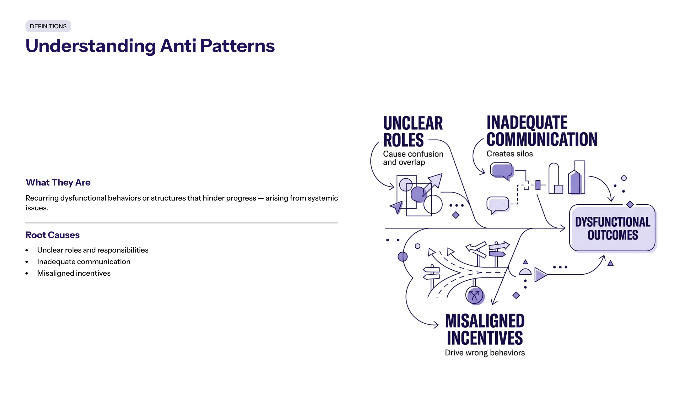 Anti patterns are recurring dysfunctional behaviors or structures that hinder progress.