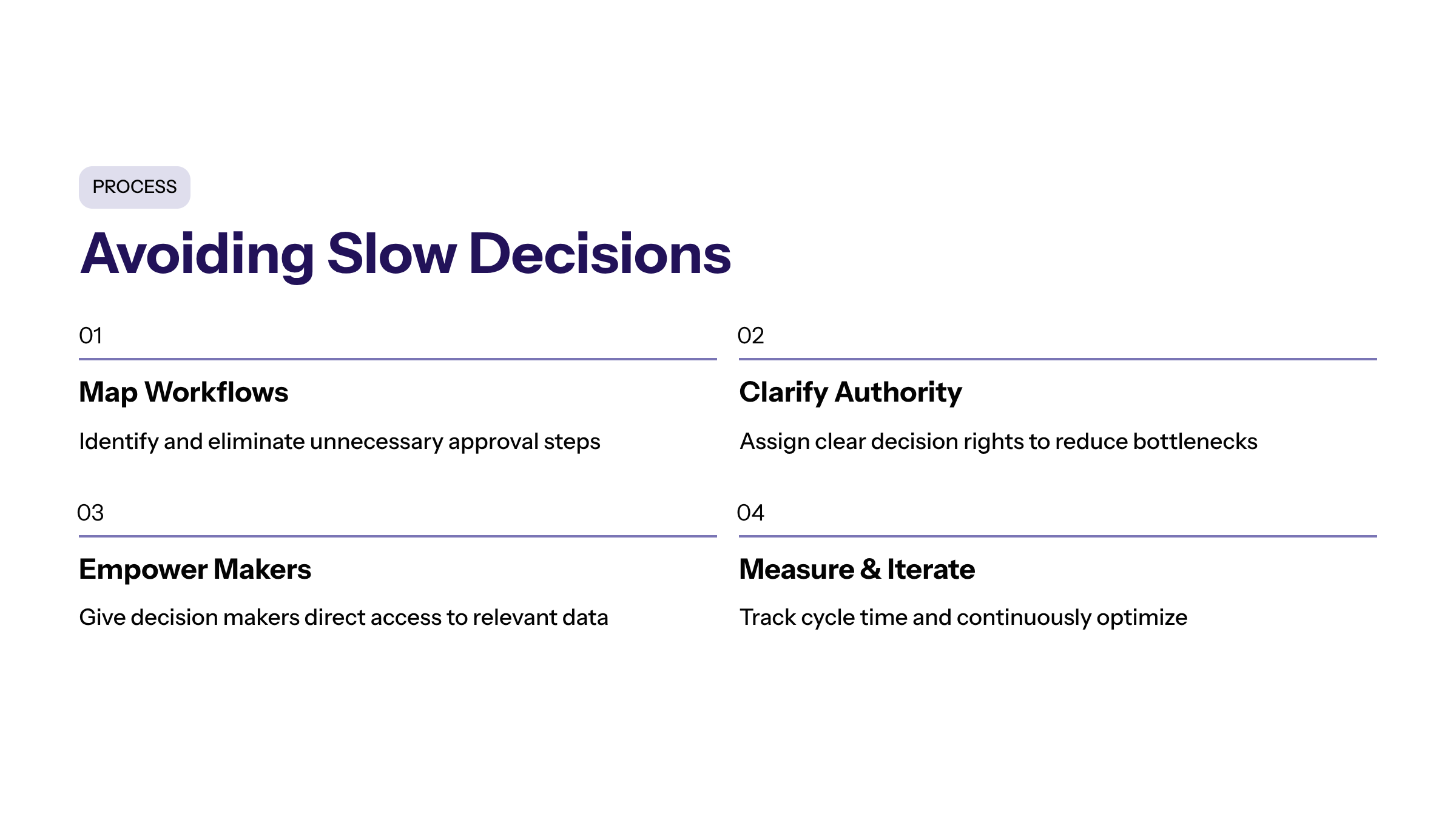 Slow decisions often result from inefficient workflows and unclear roles. To avoid this, companies should streamline the decision making process by eliminating unnecessary steps and empowering decision makers with clear authority.