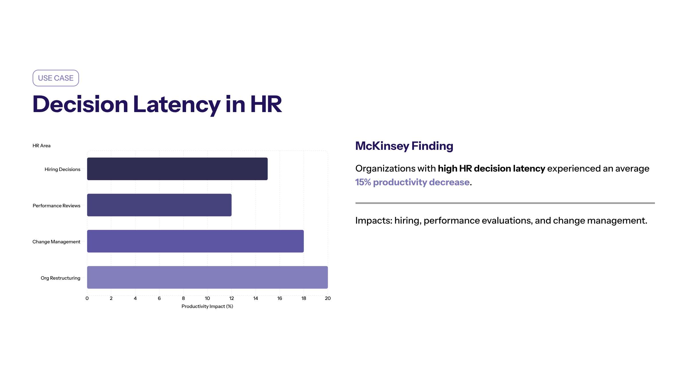 In HR, decision latency can impact hiring processes, employee performance evaluations, and organizational change management. Reducing decision latency often leads to improved efficiency and competitive advantage in HR processes. A study by McKinsey & Company found that organizations with high decision latency in their HR processes experienced an average decrease in productivity of 15%.
