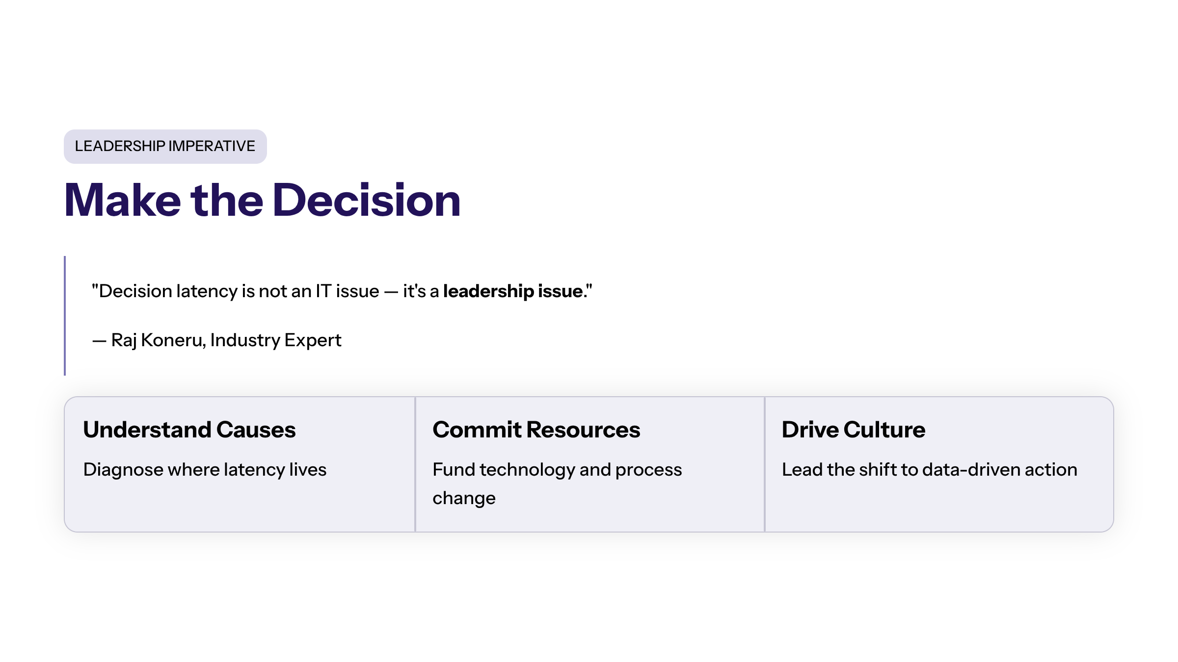 Ultimately, making the decision to reduce decision latency is a leadership imperative. It involves understanding the causes, committing resources, and driving change across technology, process, and culture.