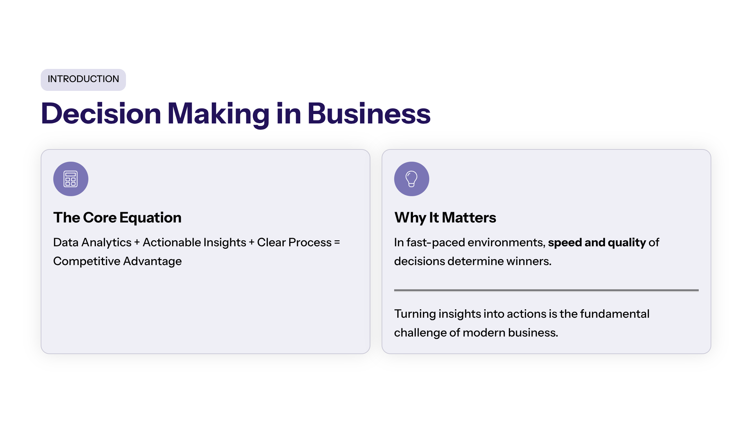 Decision making is a critical concept in business that involves turning insights into actions. It requires a combination of data analytics, actionable data, and a well-defined decision making process. Effective decision making is essential for gaining a competitive advantage in a fast-paced business environment where speed and quality of decisions matter.