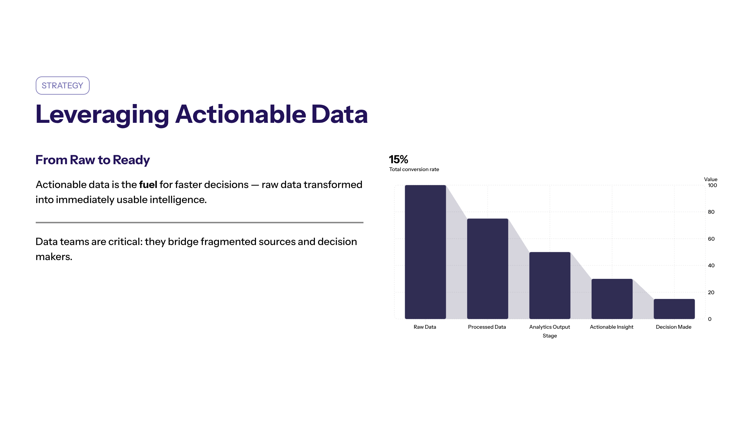 Actionable data is the fuel for faster decision making. It involves turning raw data into insights that can be immediately acted upon. Data teams play a critical role in transforming fragmented data into actionable intelligence through data analytics and business intelligence platforms.