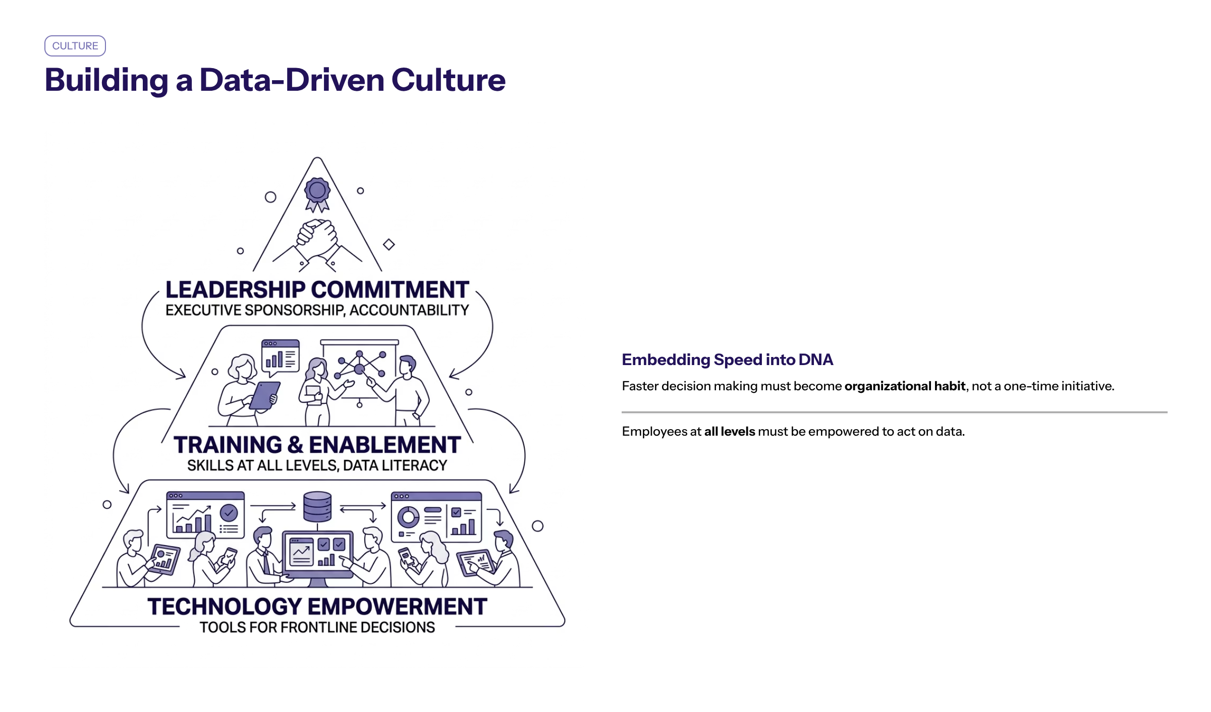 Building a data driven culture supported by technology, leadership commitment, and streamlined processes is fundamental to sustaining reduced decision latency and achieving measurable business outcomes.