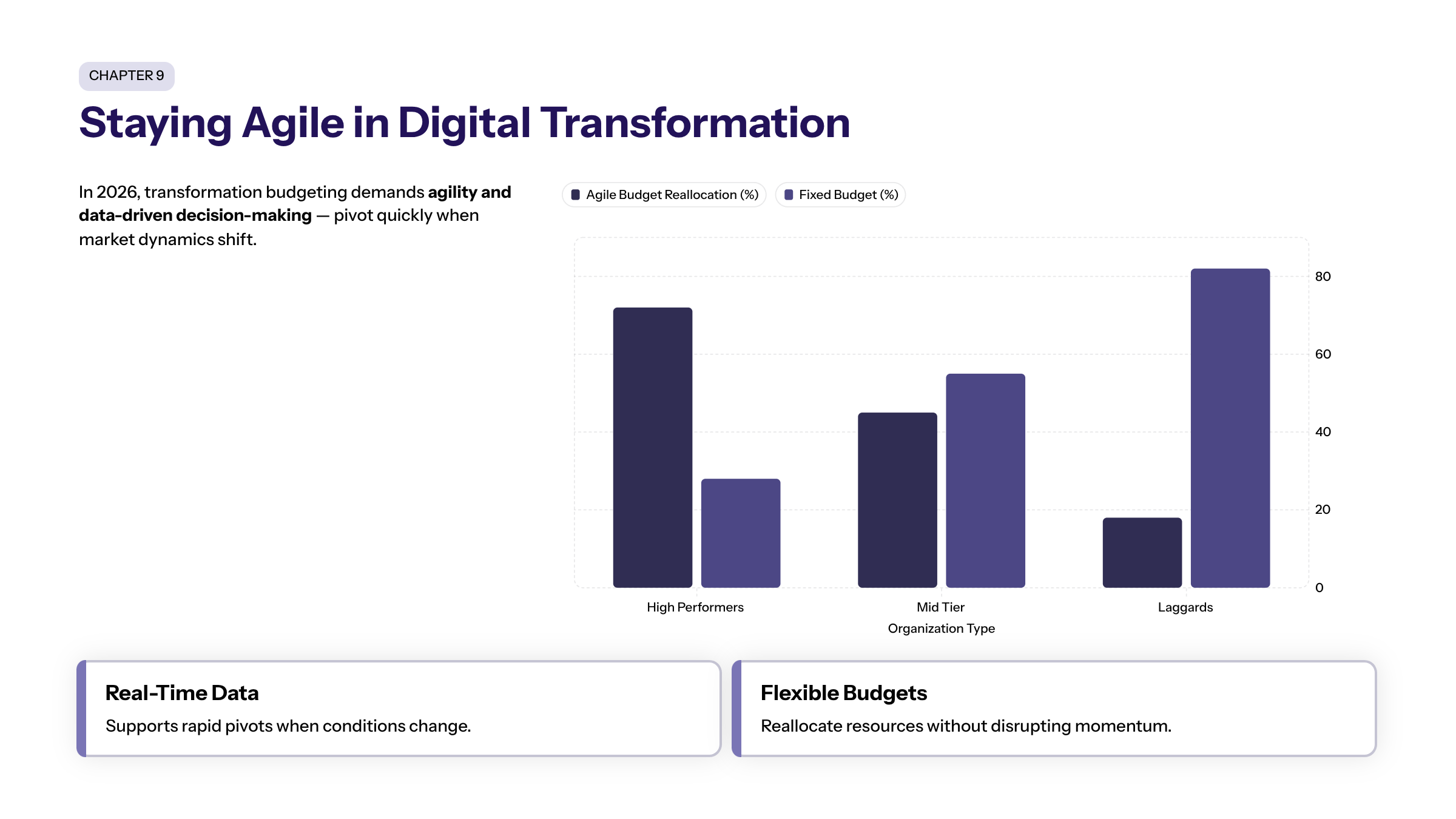 Agility in budgeting and execution is vital to respond to evolving market dynamics and technology trends. Transformation budgeting emphasizes agility and data-driven decision-making for organizations implementing this approach in 2026. Increased agility in transformation budgeting allows businesses to pivot quickly when market dynamics change, supported by real-time data.