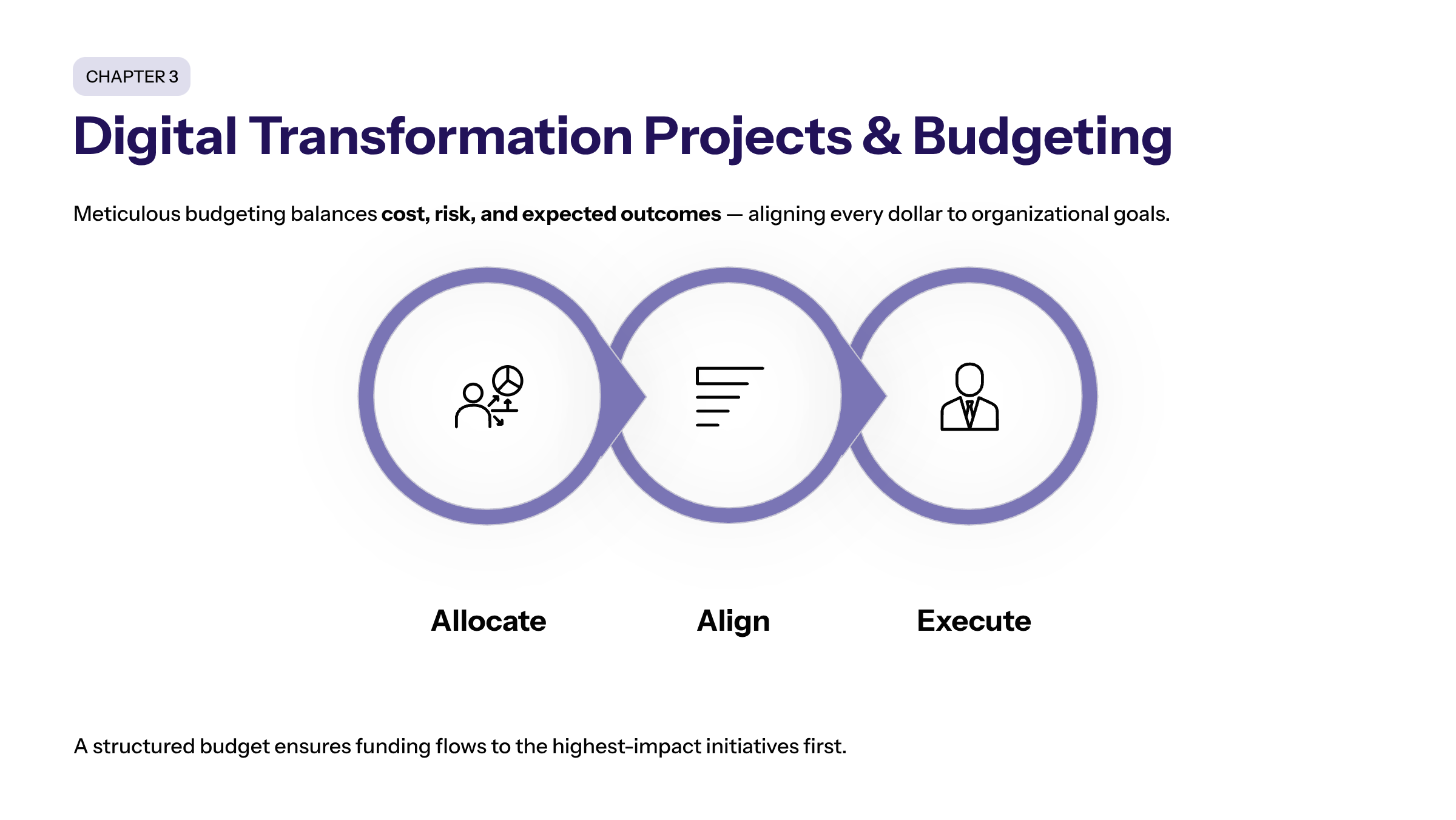 Transformation budgeting aligns an organization’s resources with its long-term transformative goals, and strategic alignment ensures every dollar is tied directly to high-level corporate goals and transformation milestones.