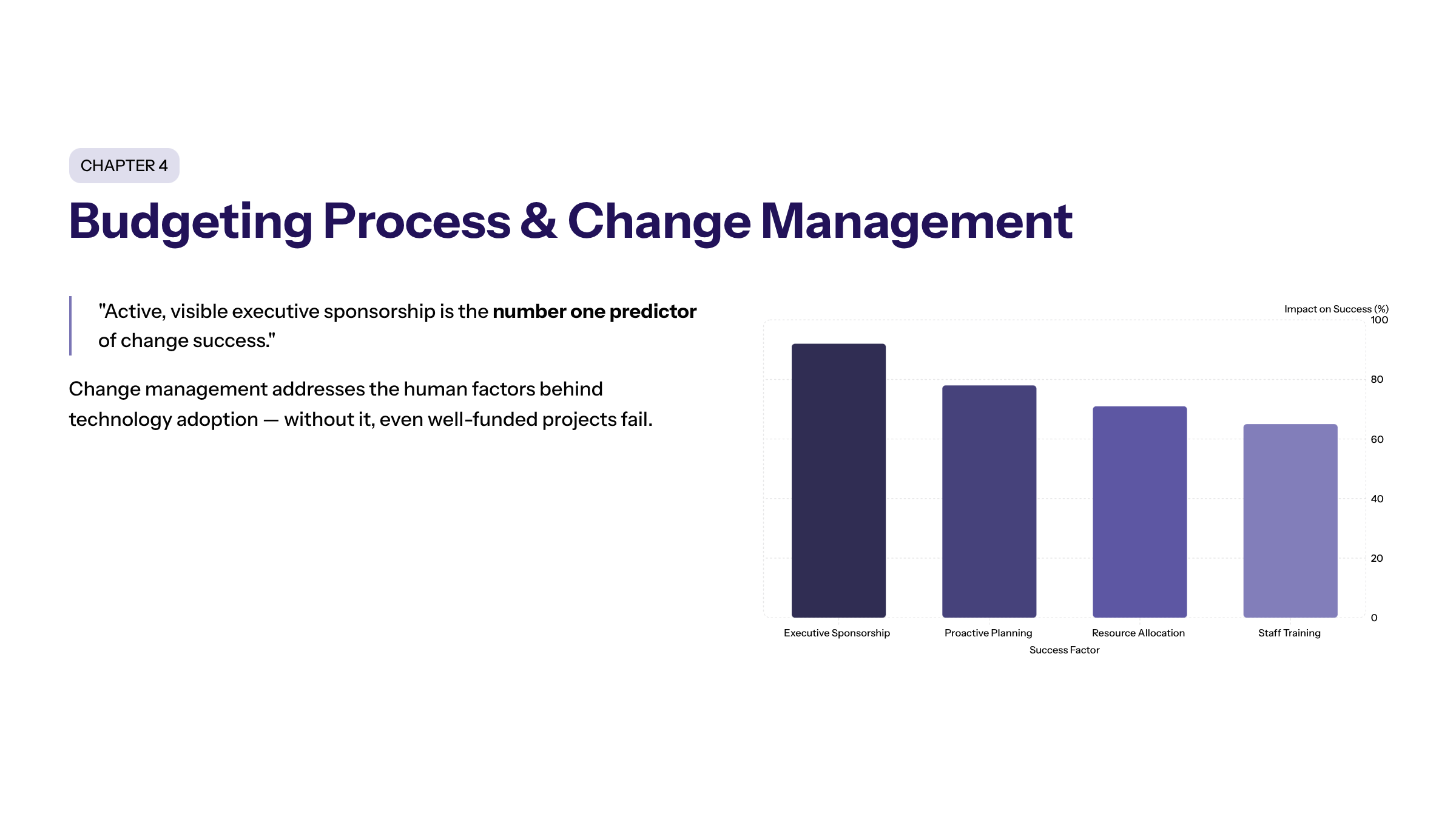 Change management is a pivotal element in transformation budgeting, addressing the human factors that influence technology adoption and project success. Proactive planning and resource allocation are essential to ensure success in transformation budgeting. Active, visible executive sponsorship is the number one predictor of change success.
