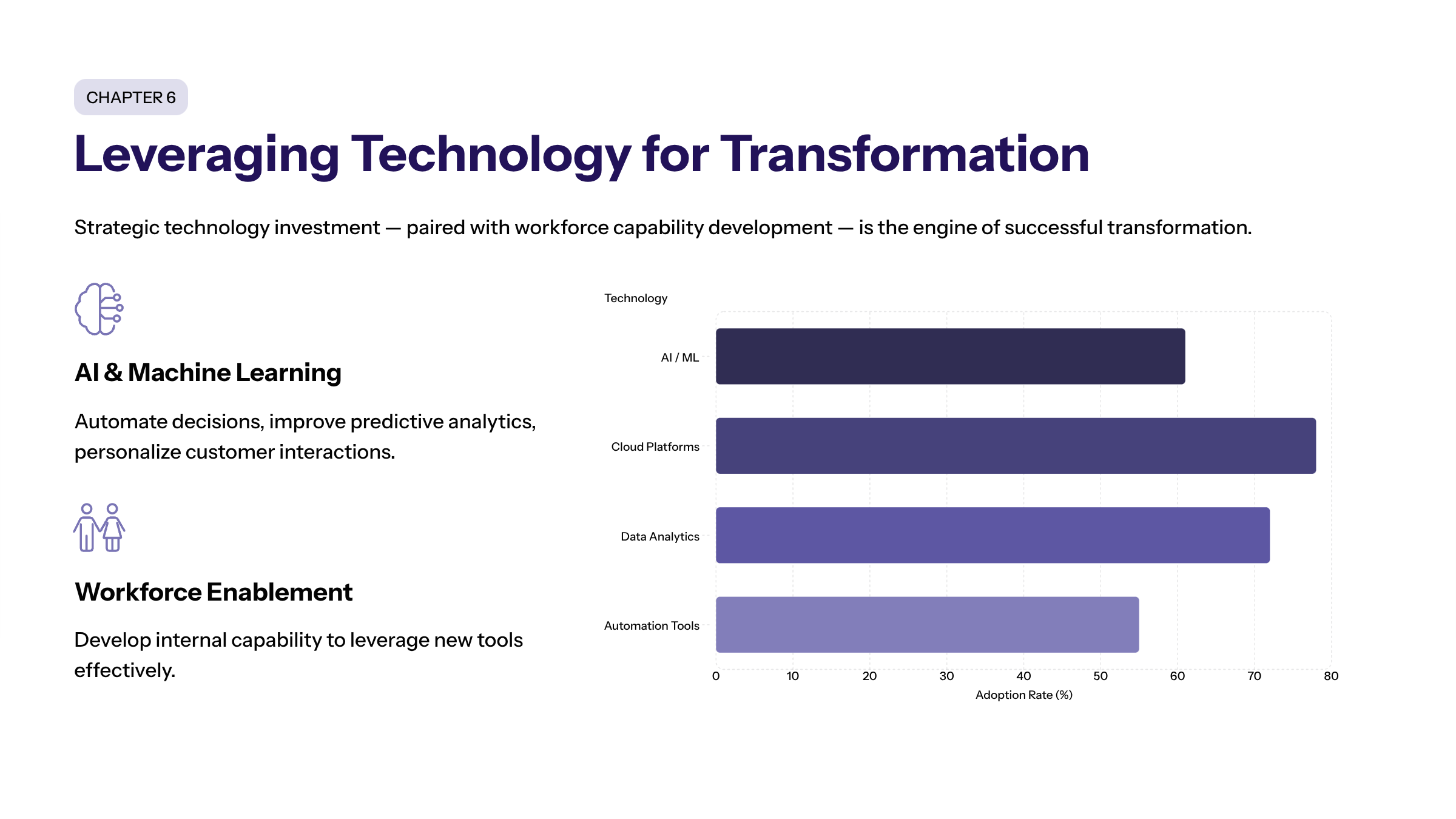 Technology investments must be strategically planned and executed to maximize their impact on business outcomes. Adopting new technology and developing the ability within the workforce to leverage these tools effectively are essential for successful transformation budgeting.