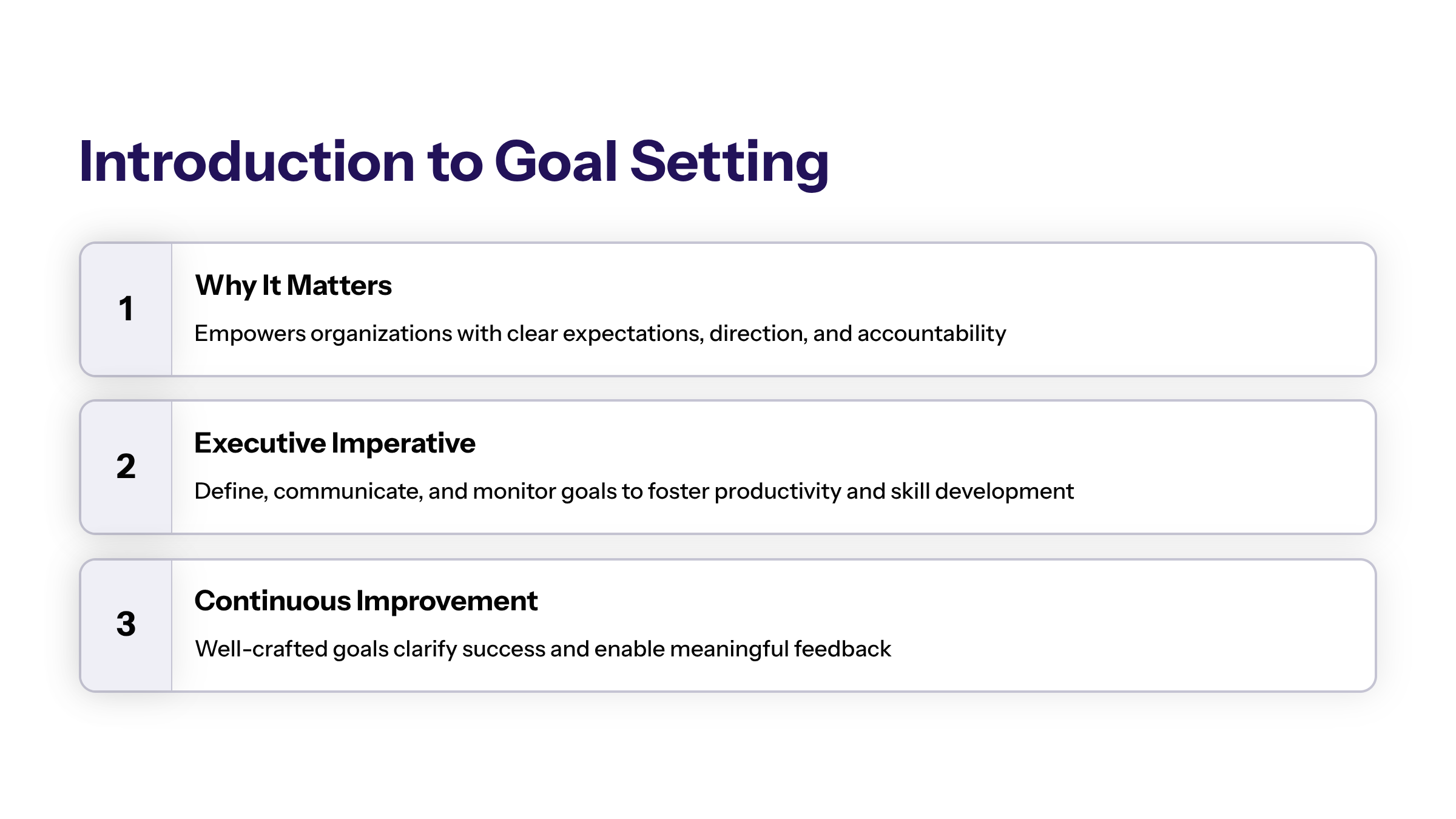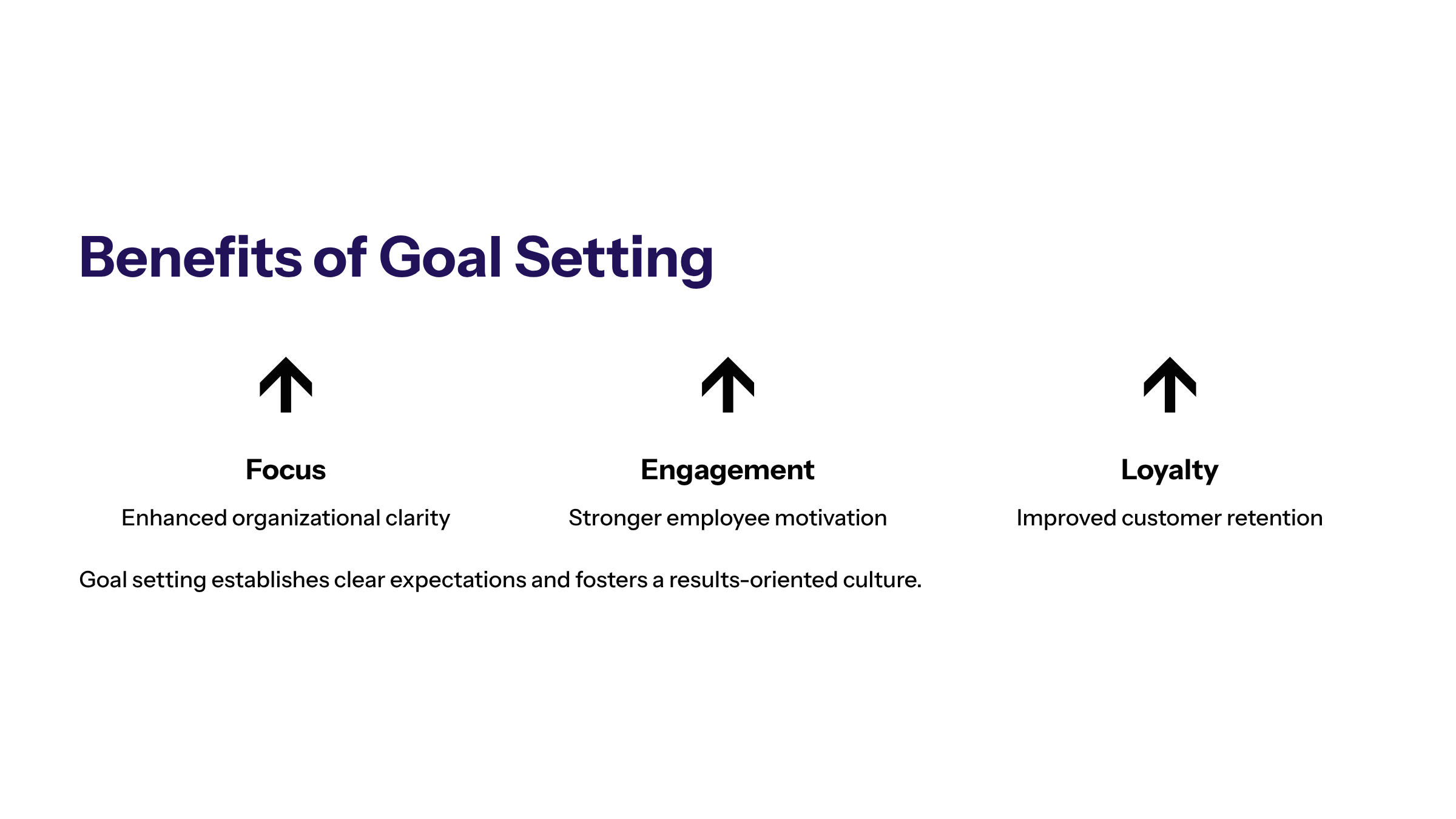 Goal setting delivers multiple organizational benefits, including enhanced focus, motivation, and performance. It establishes a clear understanding of expectations and fosters a results-oriented culture.