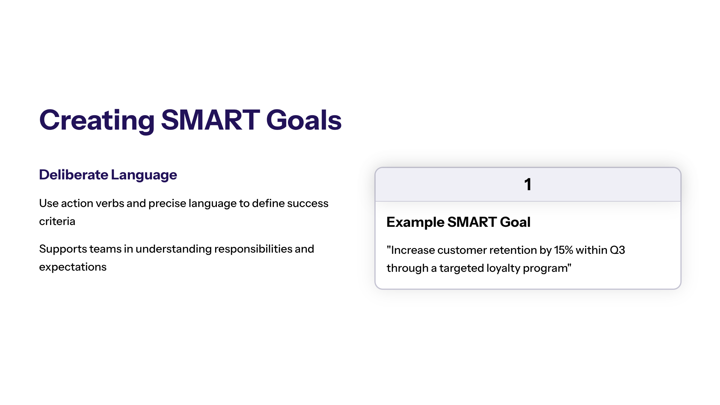 Developing smart goals requires deliberate use of action verbs and precise language to define what success looks like. This clarity supports employees and teams in understanding their responsibilities and the criteria for success.