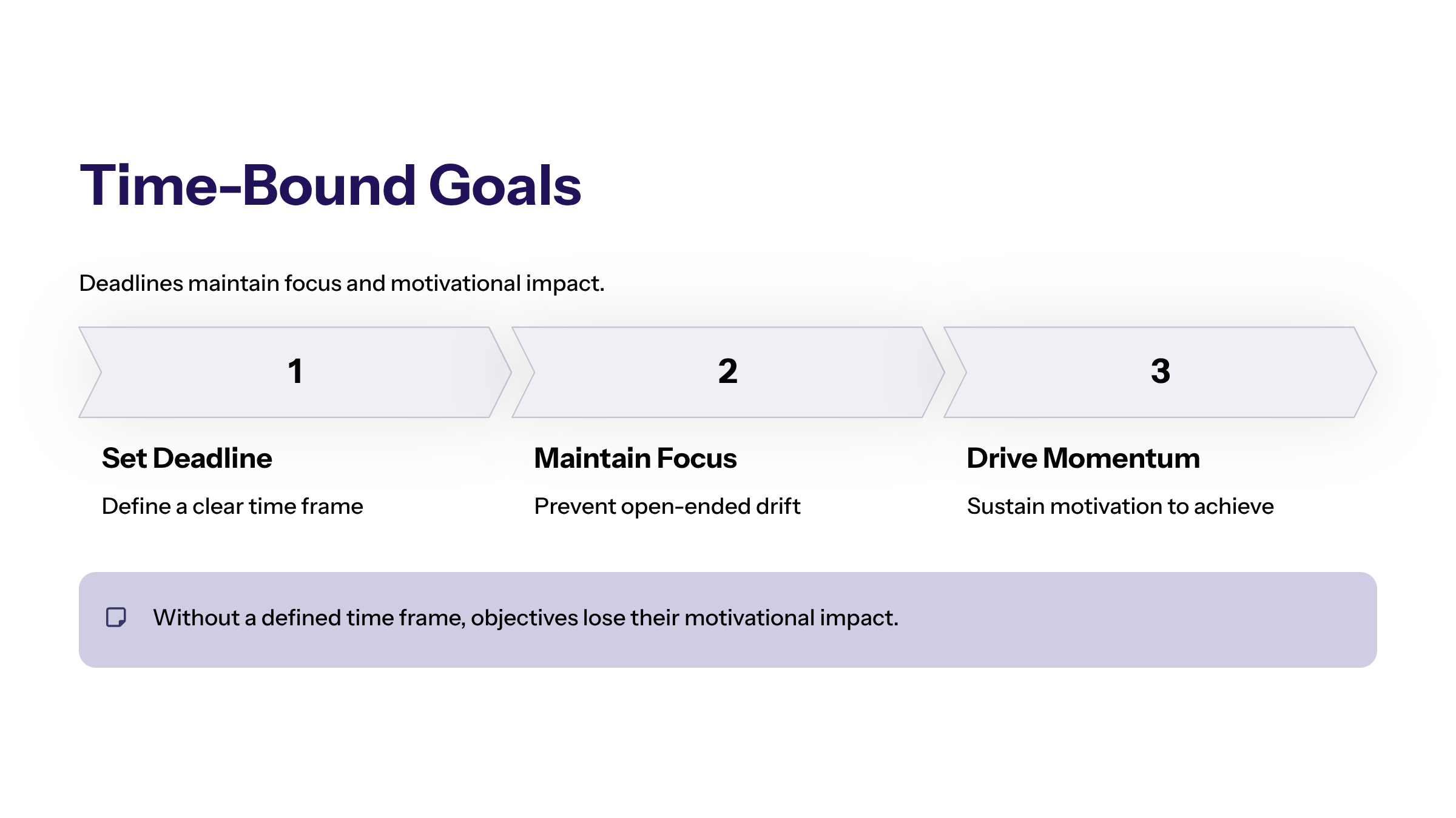 Time-bound goals establish clear deadlines that help maintain focus and momentum. Without a defined time frame, objectives risk becoming open-ended and lose their motivational impact.