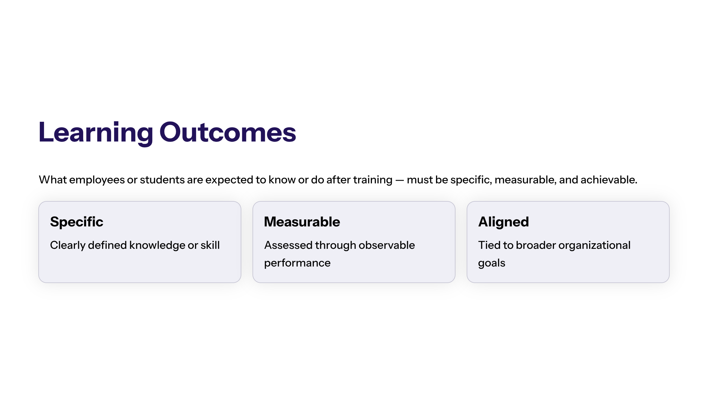 Learning outcomes articulate what students or employees are expected to know or be able to do after an educational or training experience. These outcomes must be specific, measurable, and achievable to be effective.