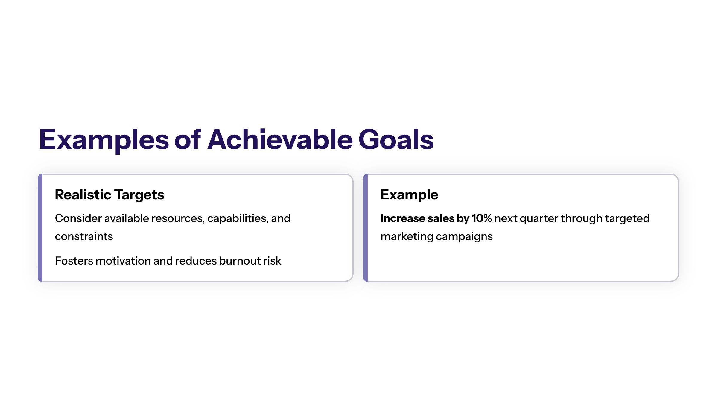 These examples demonstrate how achievable goals provide clear direction and measurable success criteria.