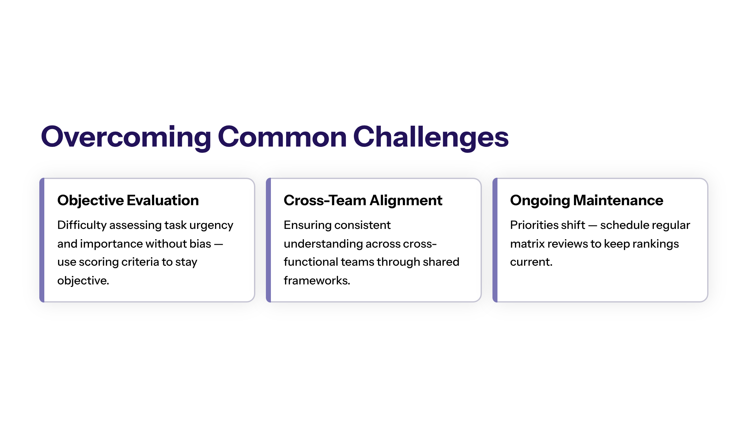 While prioritization matrices offer clarity, teams often face challenges such as: