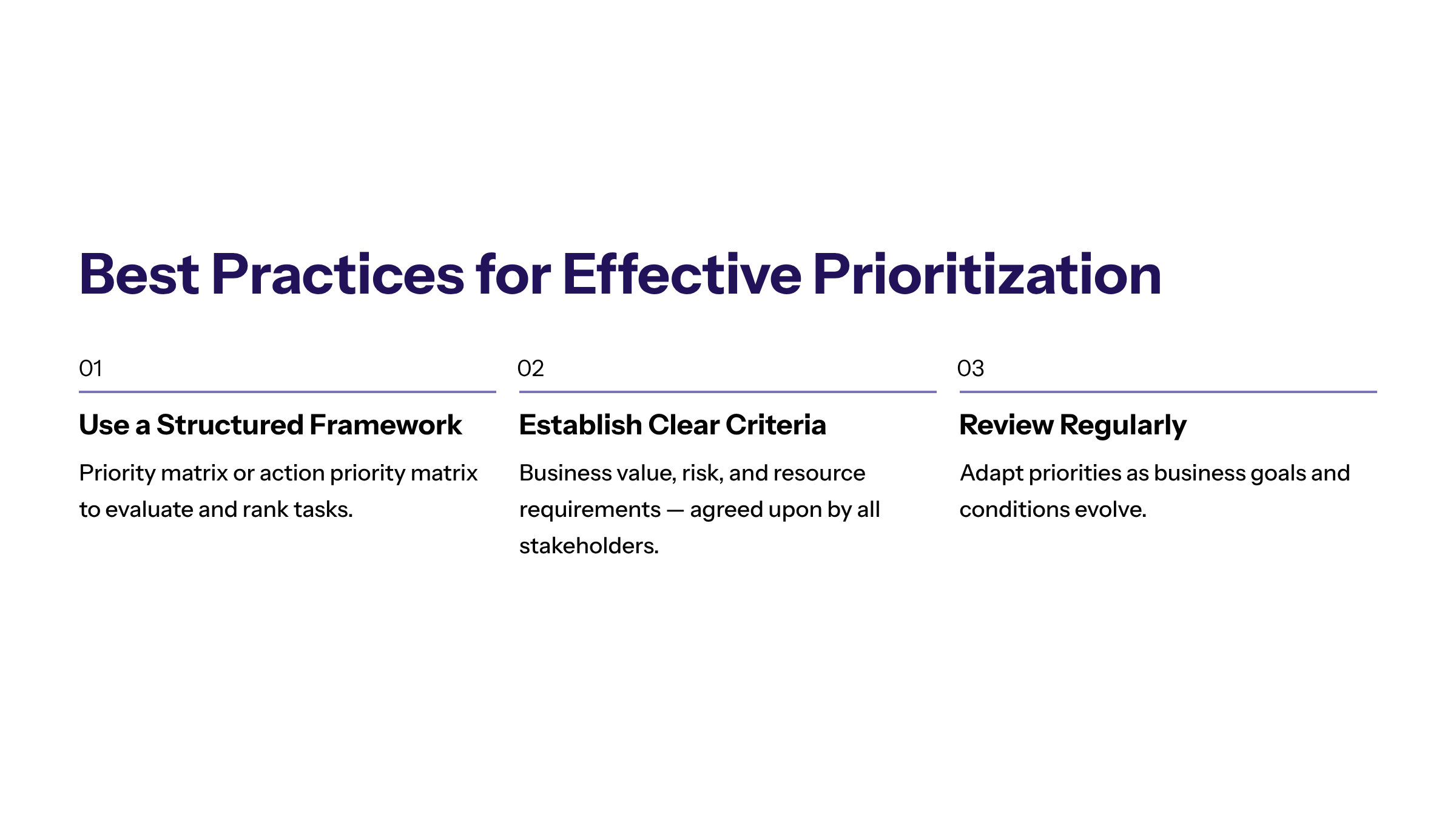 To achieve the greatest benefits from prioritization, teams should follow best practices that ensure clarity, alignment, and adaptability. Start by using a structured framework, such as a priority matrix template or action priority matrix, to evaluate and rank tasks and projects. Establish clear criteria for prioritization—such as business value, risk, and resource requirements—and ensure all stakeholders have a shared understanding of these priorities.