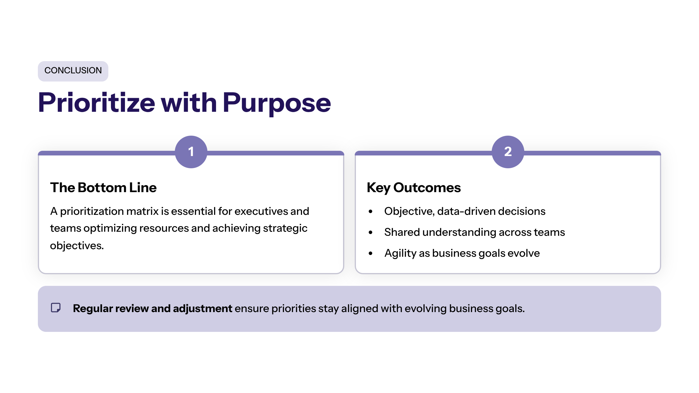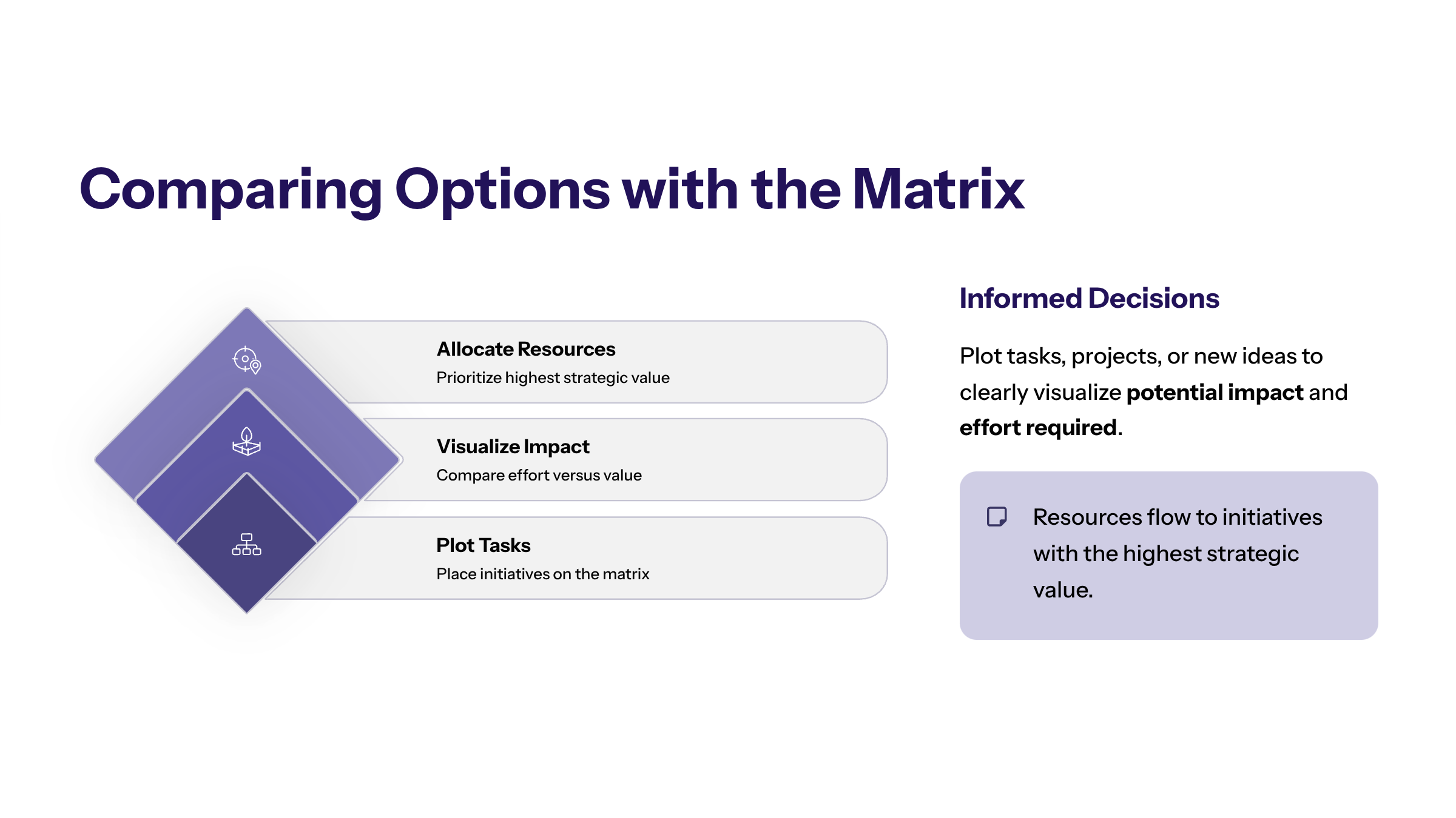 By leveraging the matrix, teams can make objective decisions, avoid bias, and ensure that every project or task supports the broader strategic direction of the business.