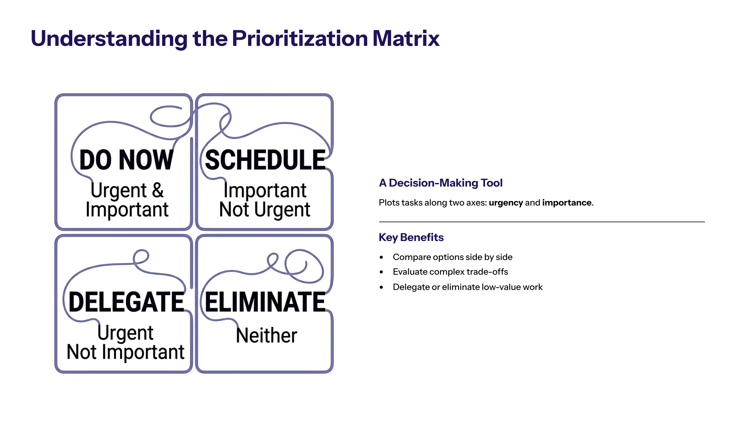 A prioritization matrix is a decision-making tool that visually plots tasks or projects along two axes—typically urgency and importance. It enables teams to compare options side by side, making it easier to evaluate multiple choices when facing complex trade-offs.