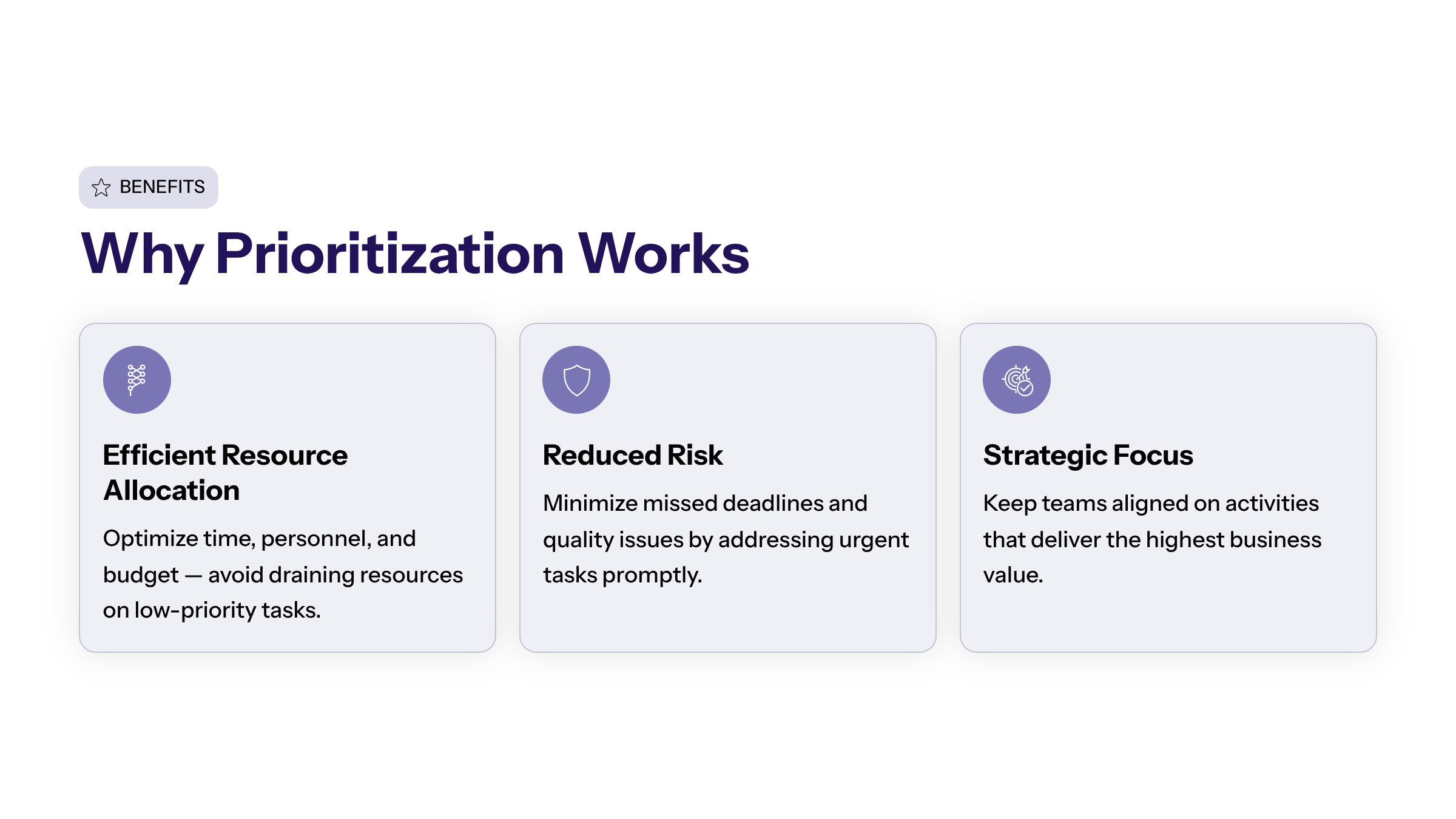 Efficient Resource Allocation: By focusing on critical tasks, teams optimize the use of time, personnel, and budget, avoiding resource drain on low-priority activities.