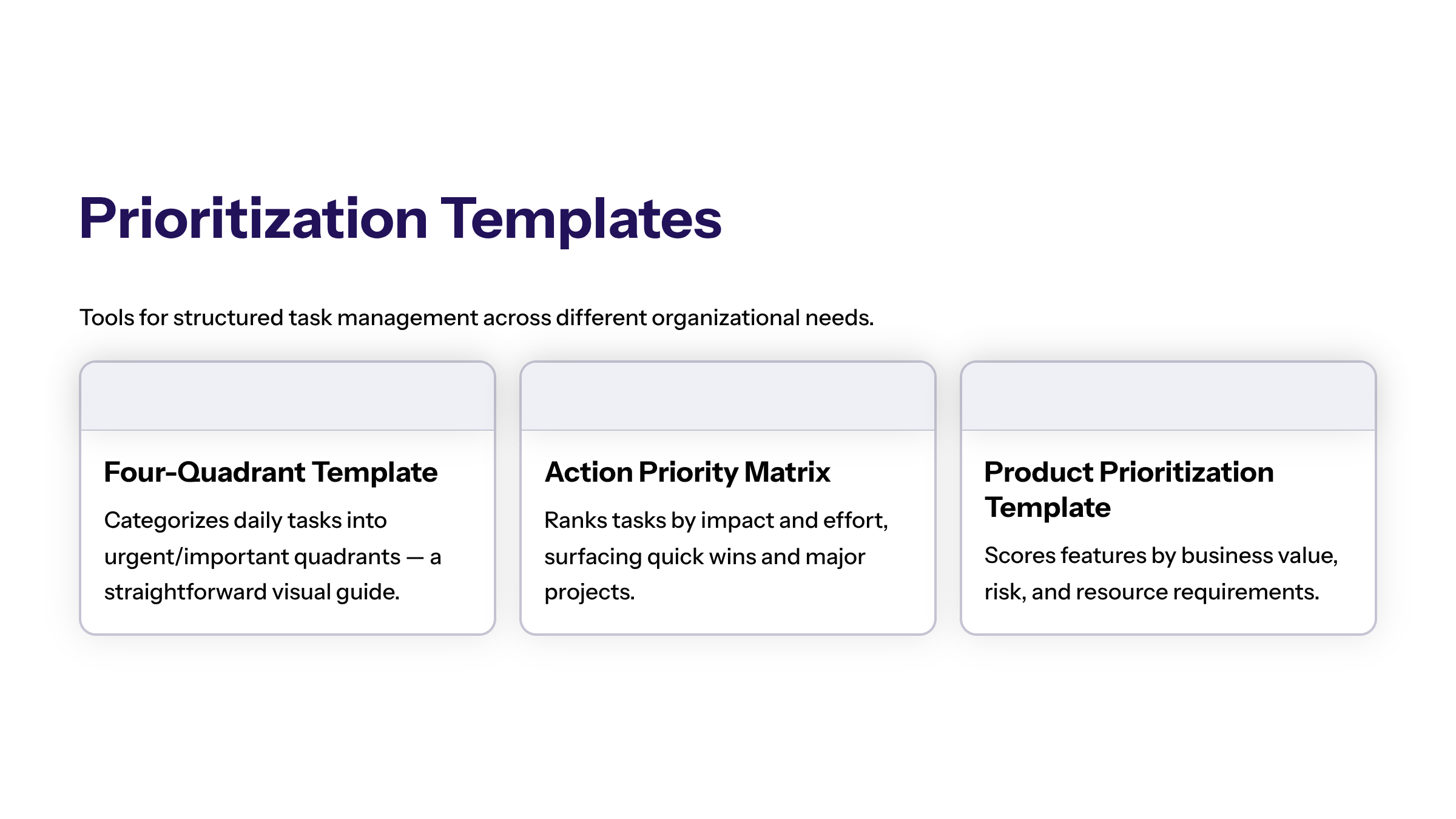 A prioritization matrix template provides a clear, visual method for organizing tasks by urgency and importance, helping teams prioritize tasks and allocate resources effectively.