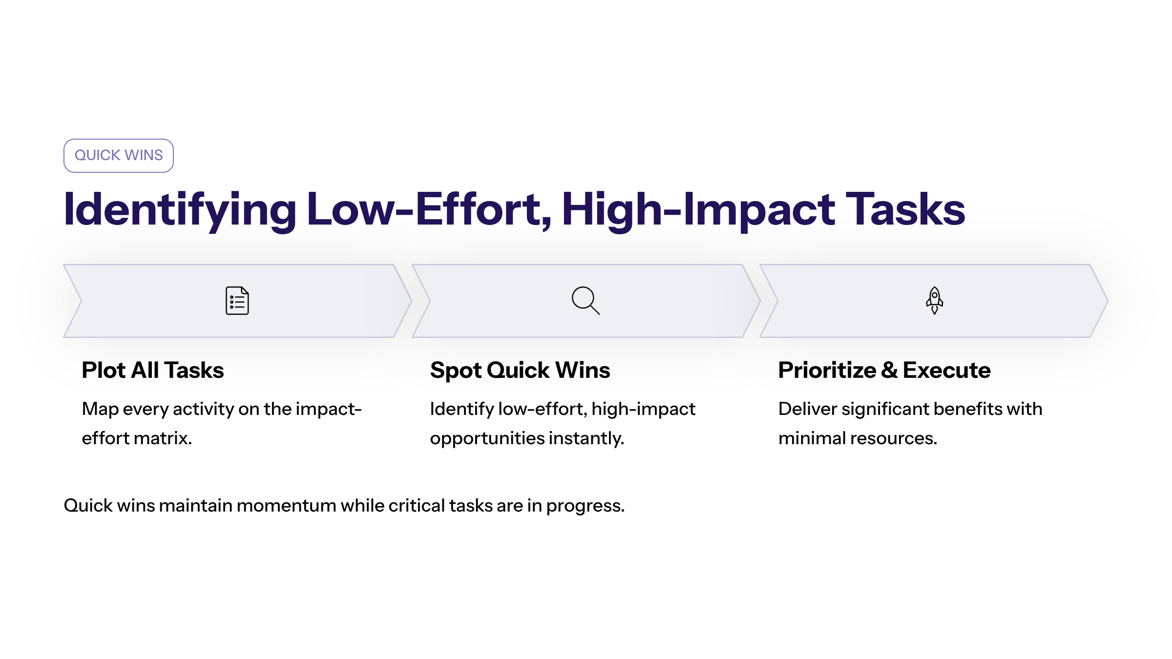 Low effort tasks, often known as “quick wins,” play a crucial role in maintaining momentum and delivering significant benefits with minimal resources.