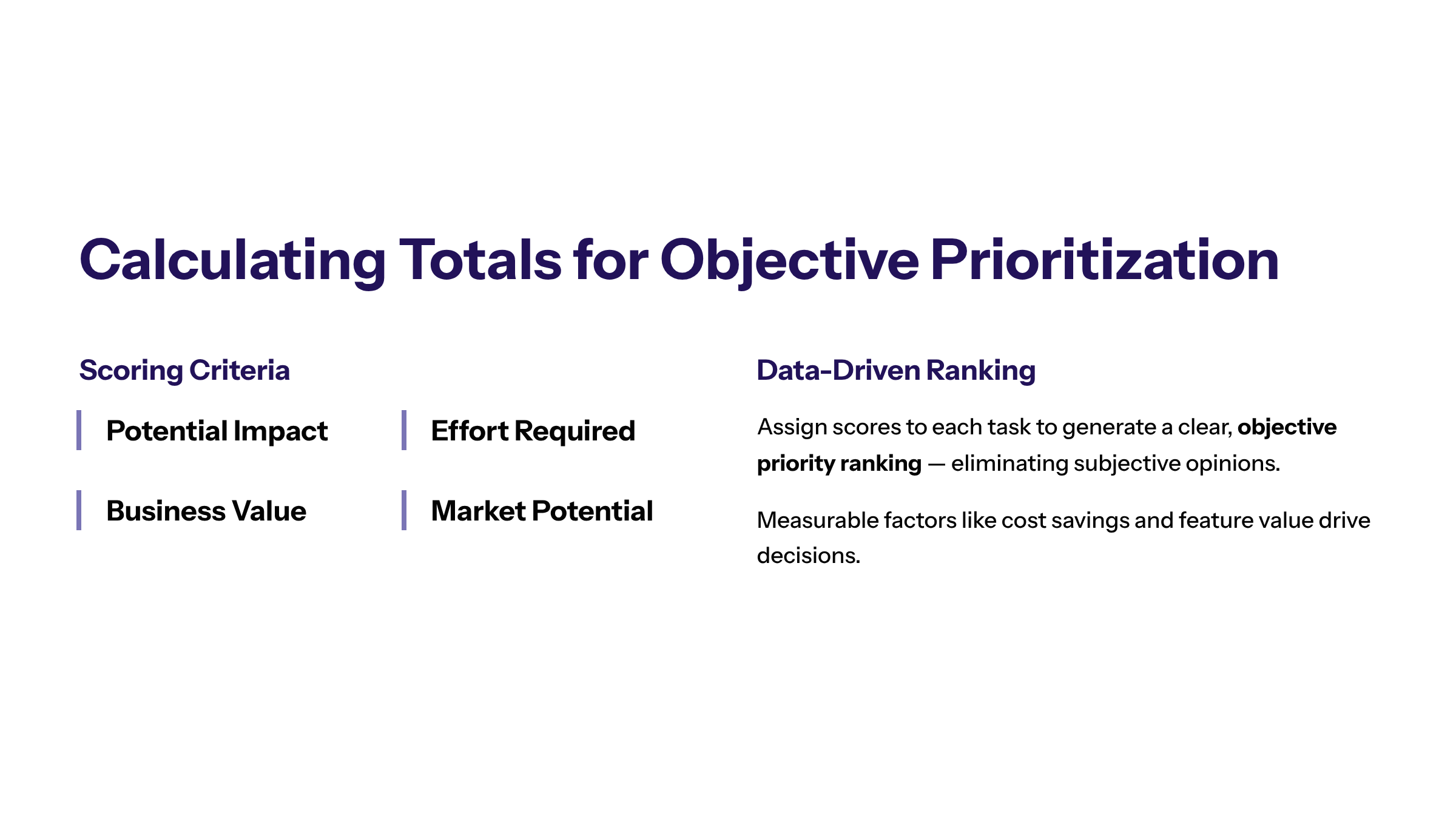 This scoring system ensures that prioritization is based on measurable factors like cost savings, market potential, and the value of new features, rather than subjective opinions. Calculating totals allows teams to compare projects and tasks side by side, making it easier to identify which initiatives should move forward.