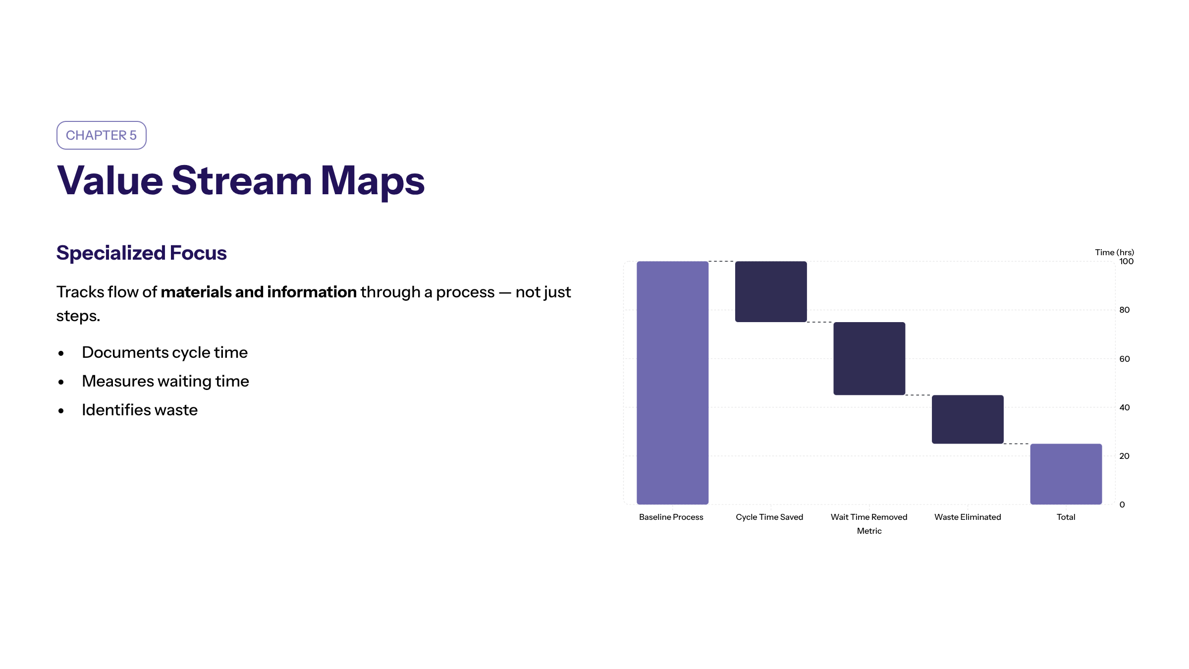 A value stream map is a specialized type of process map that focuses on the flow of materials and information through a process. It identifies waste and inefficiencies by documenting cycle time, waiting time, and other metrics. Using a value stream map helps teams visualize workflows and implement changes that enhance efficiency and reduce costs. This tool is often employed in Six Sigma process projects to improve processes by eliminating non-value-added activities.