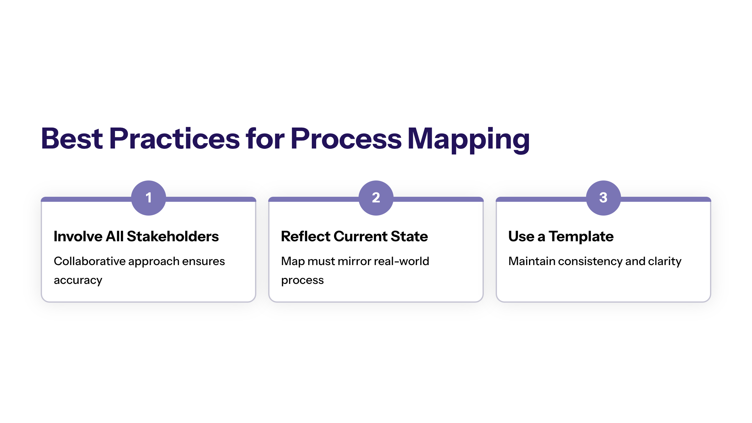 Successful process mapping relies on a collaborative approach involving all stakeholders. Engage team members and people involved in the process to gather accurate information and ensure the process map reflects the current state. Use a business process mapping template to maintain consistency and clarity. Regularly update the process map to keep it accurate and relevant. Including all the details related to each step in the process ensures the map remains a useful resource throughout the project.