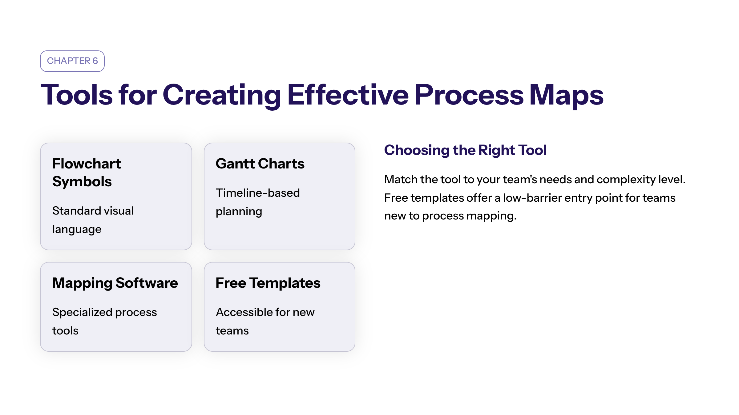 Various tools are available for creating process maps, ranging from flowchart symbols and Gantt charts to specialized process mapping software. Choose a tool that fits your team's needs and allows you to visually communicate the process clearly. Many free process map templates are also available, providing accessible options for teams new to process mapping. These tools help project managers maintain a high-level process overview while also capturing all the details necessary for process improvement.