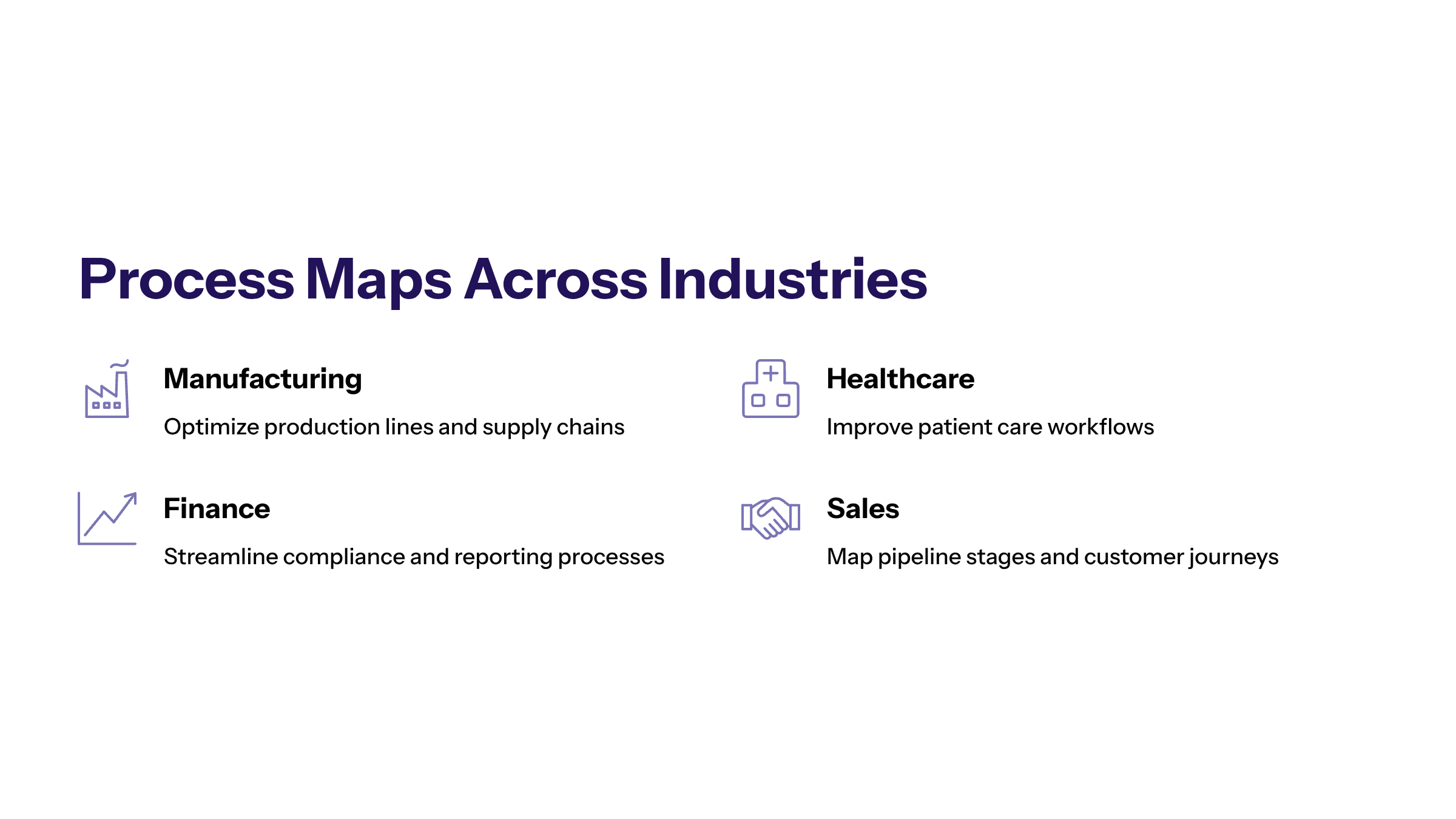 Process maps are widely used across industries such as manufacturing, healthcare, finance, and sales. In manufacturing, process maps help optimize production lines and supply chains. Healthcare organizations use them to improve patient care workflows. Finance teams leverage process maps to streamline approval processes, increase transparency, and enhance accountability by identifying responsible teams for each step. Sales departments use process maps to guide teams from the early stages of a sale until the closing of a deal. Human resources departments benefit from process maps for job applications, onboarding, payroll processes, and offboarding.
