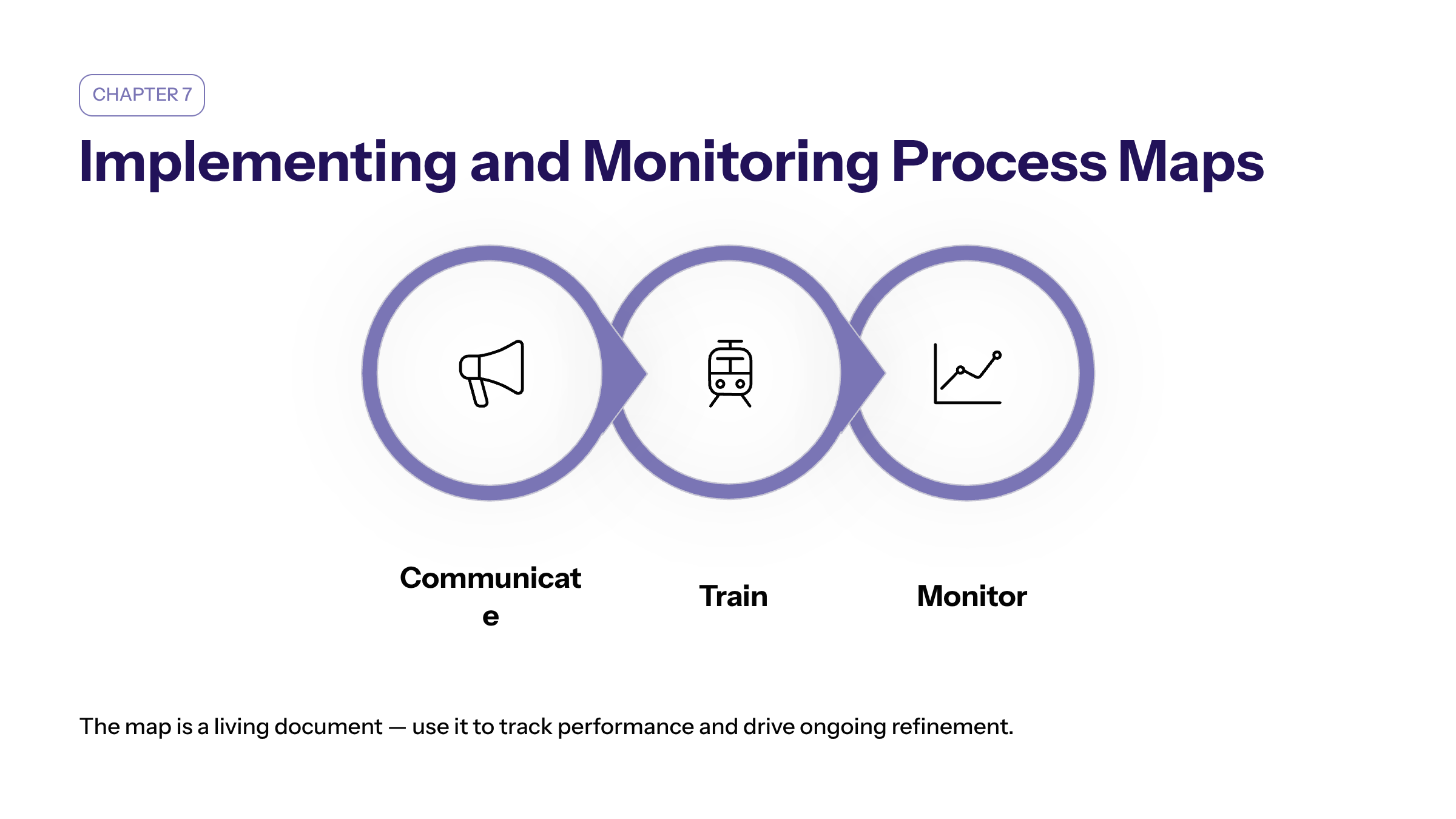 After creating a process map, communicate the changes and new workflows to the team. Provide training to ensure everyone understands their role and responsibilities. Use the process map to monitor performance, identify bottlenecks, and implement continuous improvements. Tracking metrics like cycle time and throughput helps measure the success of process improvements. Project managers can use these insights to identify areas where further improvements are needed and adjust the process accordingly.