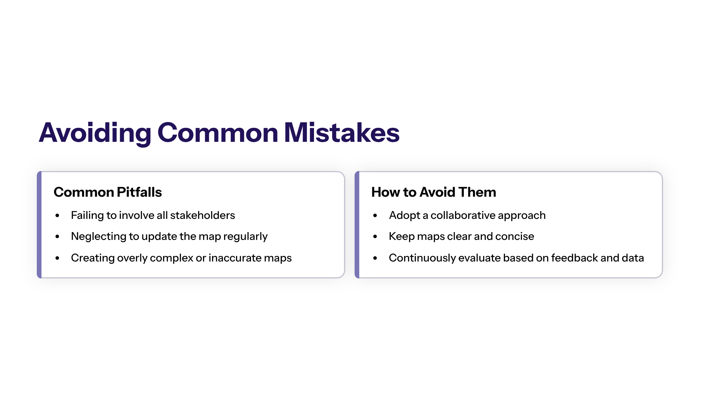 Common pitfalls in process mapping include failing to involve all stakeholders, neglecting to update the map regularly, and creating overly complex or inaccurate maps. To avoid these mistakes, adopt a collaborative approach, keep the process map clear and concise, and continuously evaluate and refine the process based on feedback and performance data. Ensuring the map captures all the details related to the process helps prevent misunderstandings and supports successful project outcomes.