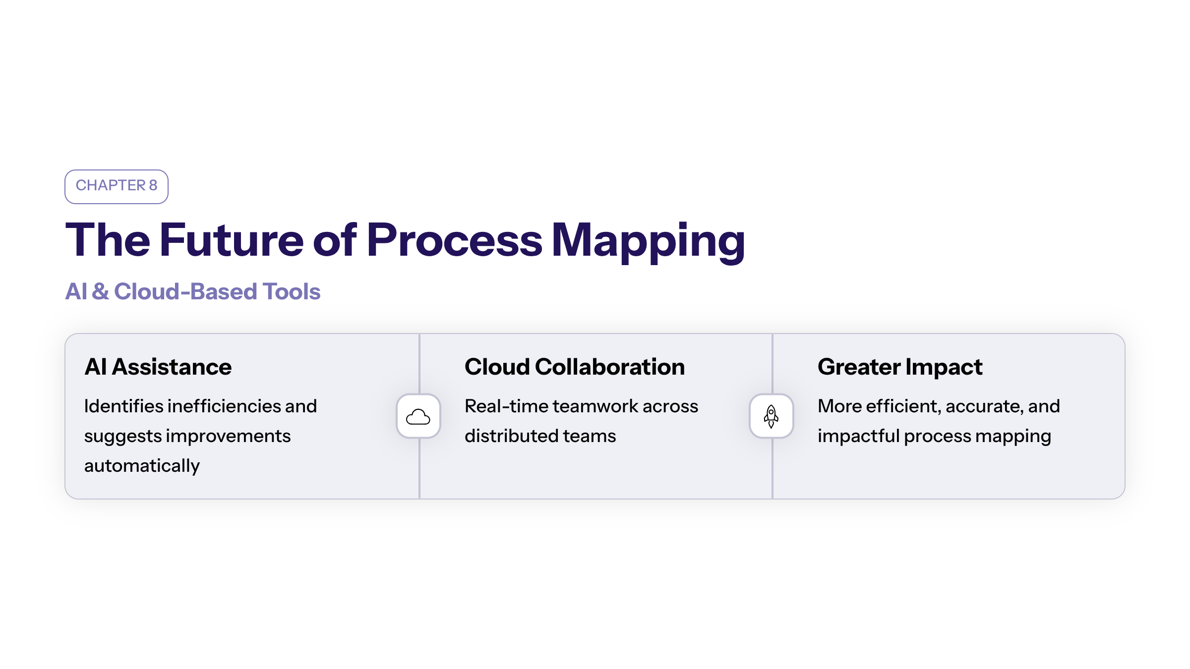 The future of process mapping is shaped by emerging technologies such as artificial intelligence and cloud-based collaboration tools. AI can assist in identifying process inefficiencies and suggesting improvements, while cloud-based software enhances real-time collaboration among distributed teams.