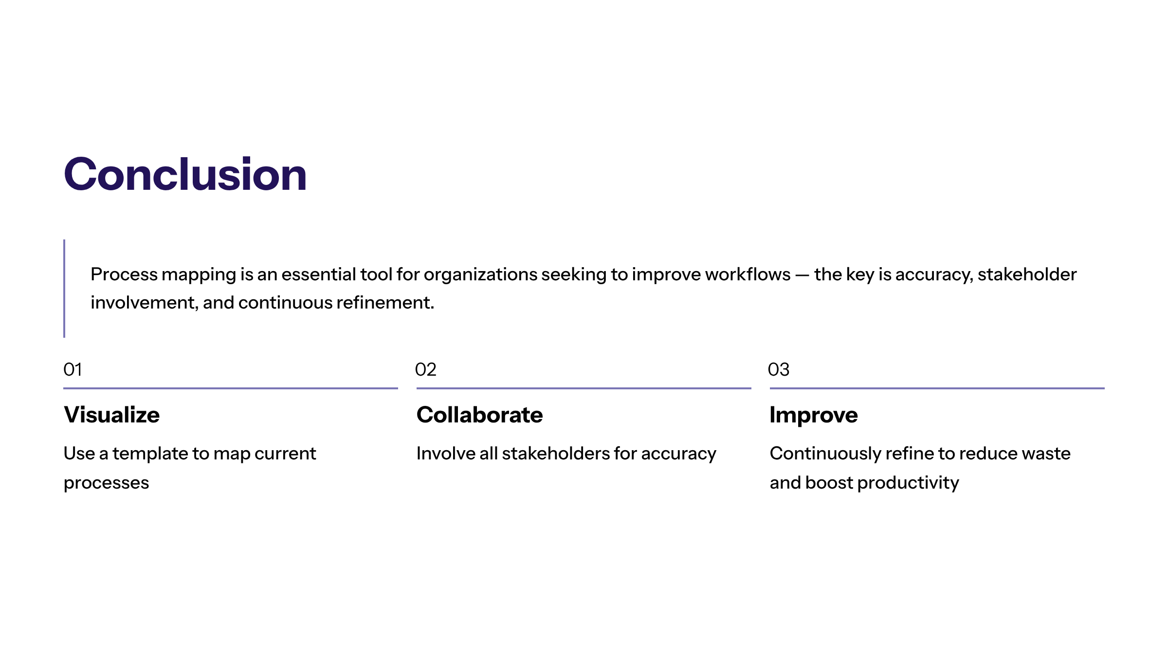 In conclusion, process mapping is an essential tool for organizations seeking to improve their workflows and business processes. By visually mapping processes using a business process mapping template, teams gain better understanding, improve communication, and identify opportunities for process improvement.