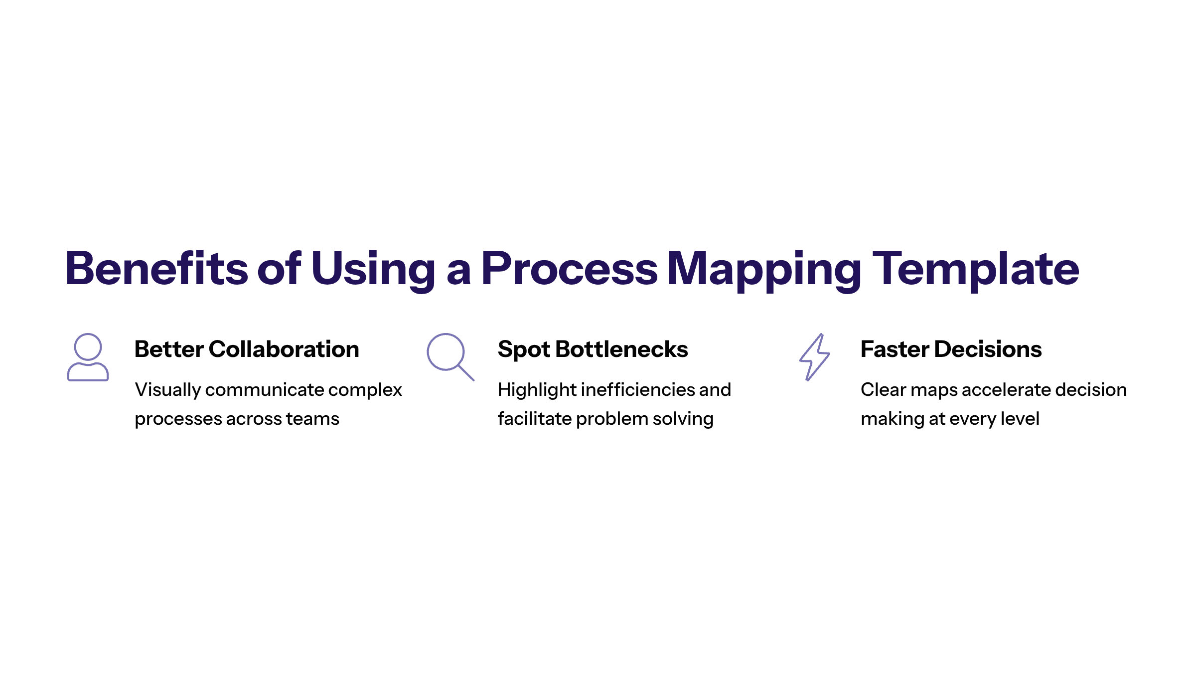 Using a process mapping template offers numerous benefits for any project. It helps teams visually communicate complex processes, enabling better communication and collaboration among people involved. Process maps highlight bottlenecks and inefficiencies, facilitating problem solving and decision making. Additionally, process maps serve as valuable training tools for new employees, ensuring everyone is on the same page and understands their role within the same process. Ultimately, process mapping enhances productivity by streamlining workflows and eliminating waste, which is essential for continuous improvement in all projects.