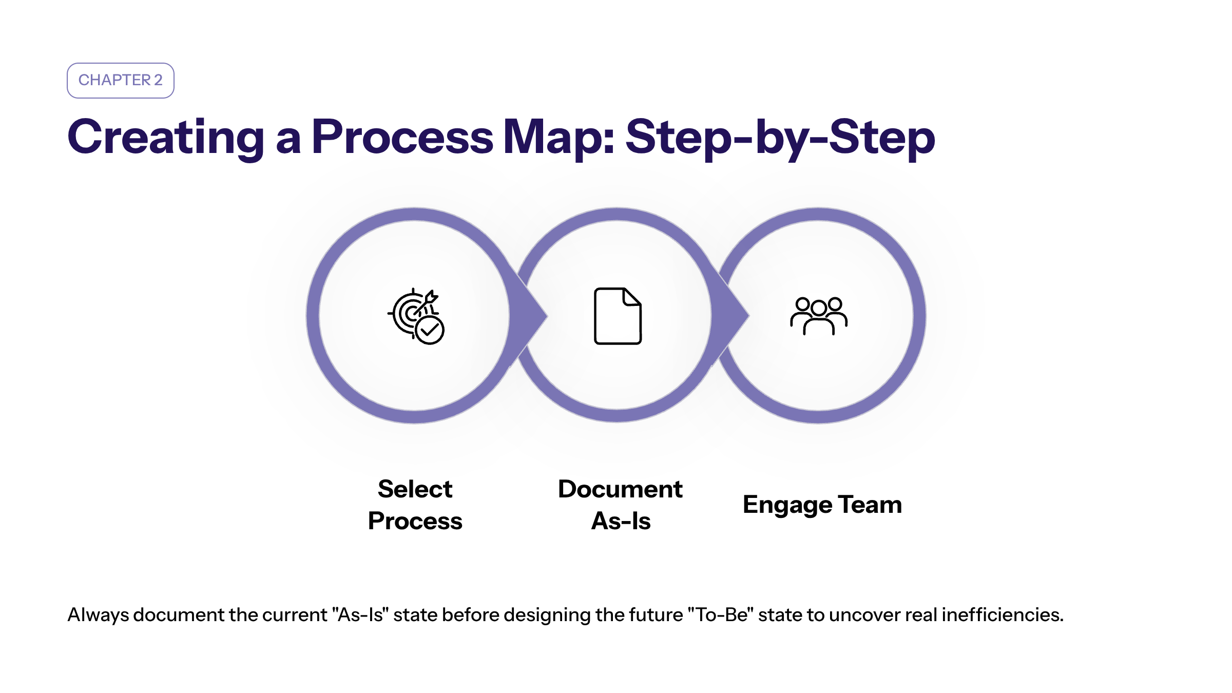 To create a process map for your project, start by selecting the specific process you want to visualize. It is important to document the 'As-Is' state of the process before designing the 'To-Be' future state to understand current inefficiencies and areas for improvement. Gather information by engaging with team members and observing the current process in action. Use a business process mapping template to visually communicate the process flow, ensuring you include all the steps, task dependencies, decision points (often indicated by diamond shapes), and raw materials involved. Rectangles represent specific actions or work steps, while ovals mark the absolute beginning and end of the process, defining its boundaries in the mapping template. Arrows connect these elements to show the logical order and direction of the workflow.