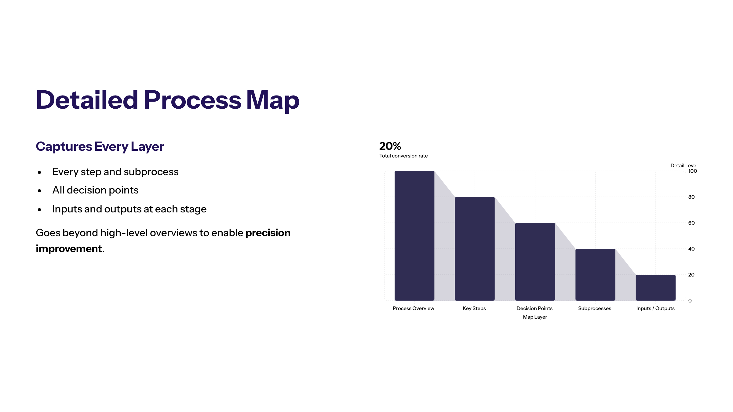 A detailed process map provides an in-depth visual representation of a complex process. Unlike a simple process map template that gives a high-level overview, a detailed process map captures every step, decision point, and subprocess involved. This comprehensive approach enables teams to identify inefficiencies and areas for improvement with precision. Detailed process maps are particularly useful in industries where understanding all the details is crucial for compliance, quality assurance, or process optimization, especially when implementing methodologies like the Six Sigma process to improve processes systematically.