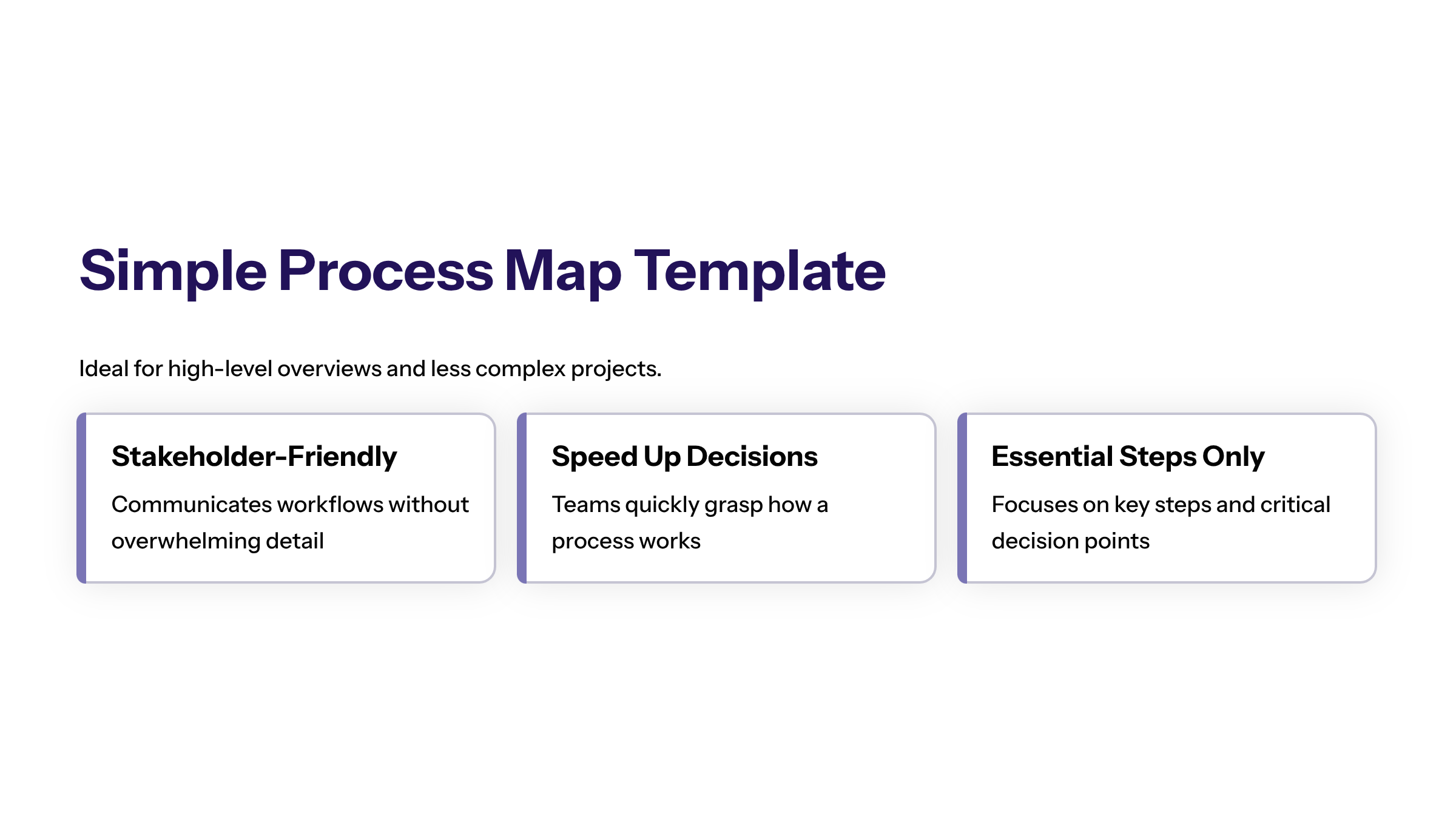 A simple process map template offers a straightforward way to visualize a process by focusing on the key steps and decision points without overwhelming detail. This type of map is ideal for communicating workflows to stakeholders who need a high-level understanding or for projects that are less complex. Using a simple process map template can speed up decision making and help teams quickly grasp how a process works, while still providing enough details related to the essential steps.