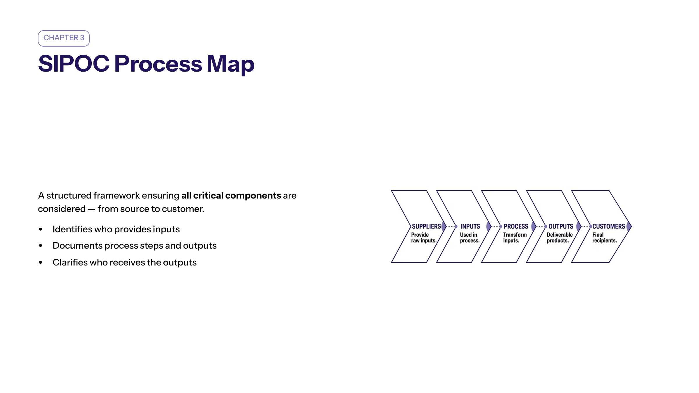 The SIPOC (Suppliers, Inputs, Process, Outputs, Customers) process map is a valuable tool for categorizing and visualizing the key elements of a process. It identifies who provides the inputs, what the inputs are, the process steps, the outputs produced, and the customers who receive those outputs. This format helps ensure all critical components are considered, making it easier to identify inefficiencies and improve the entire process flow. SIPOC maps are especially useful in projects aiming to improve processes by gaining insight into the relationships between suppliers and customers.
