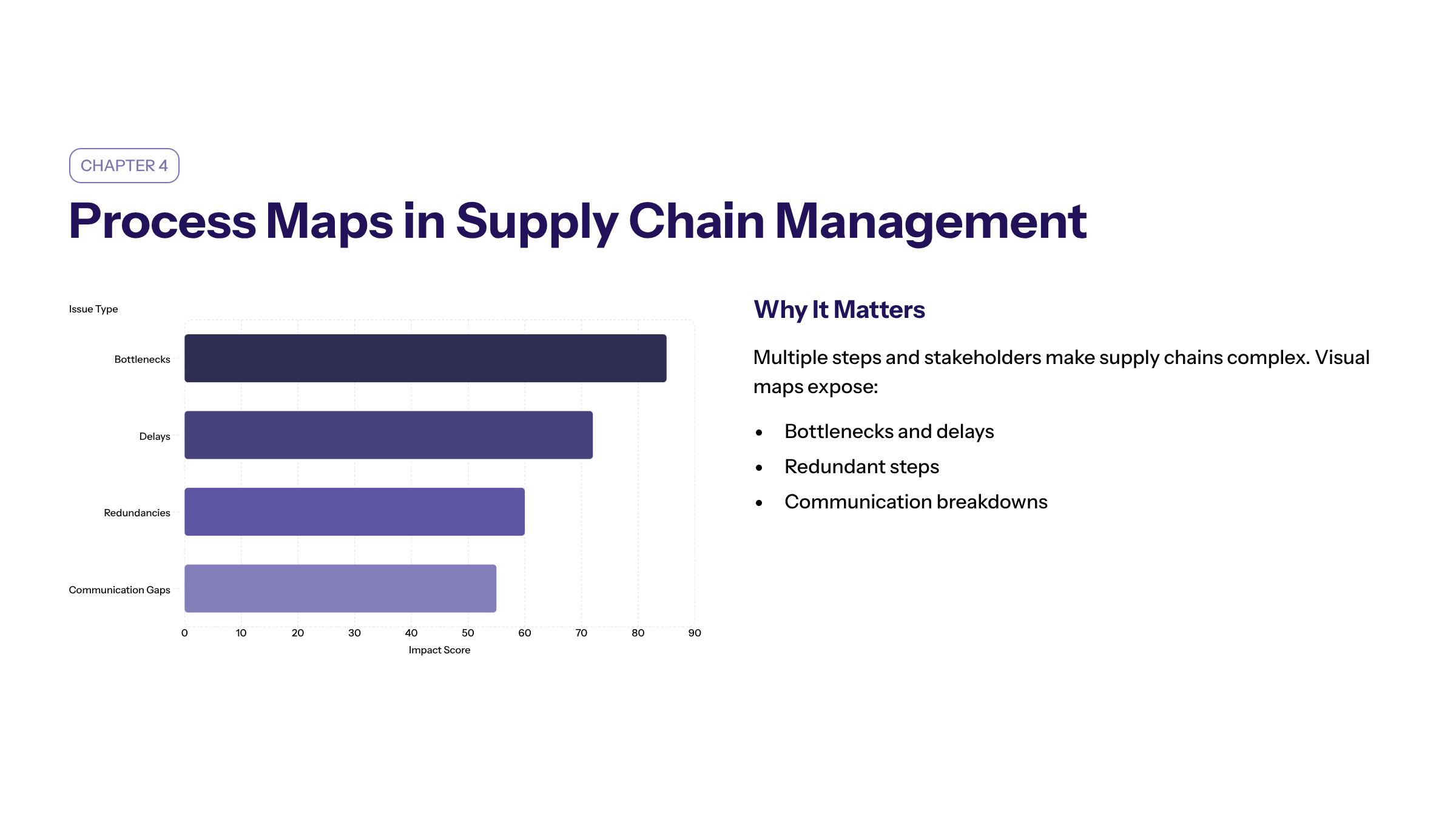 Process maps are especially useful in supply chain management, where multiple steps and stakeholders are involved. By visually mapping the flow of raw materials, information, and products, teams can identify bottlenecks, delays, and redundancies. This clarity enables targeted process improvements, better communication among supply chain partners, and enhanced overall performance. A value stream map, a type of detailed process map, can be used in supply chain projects to document cycle times and identify areas where delays occur.