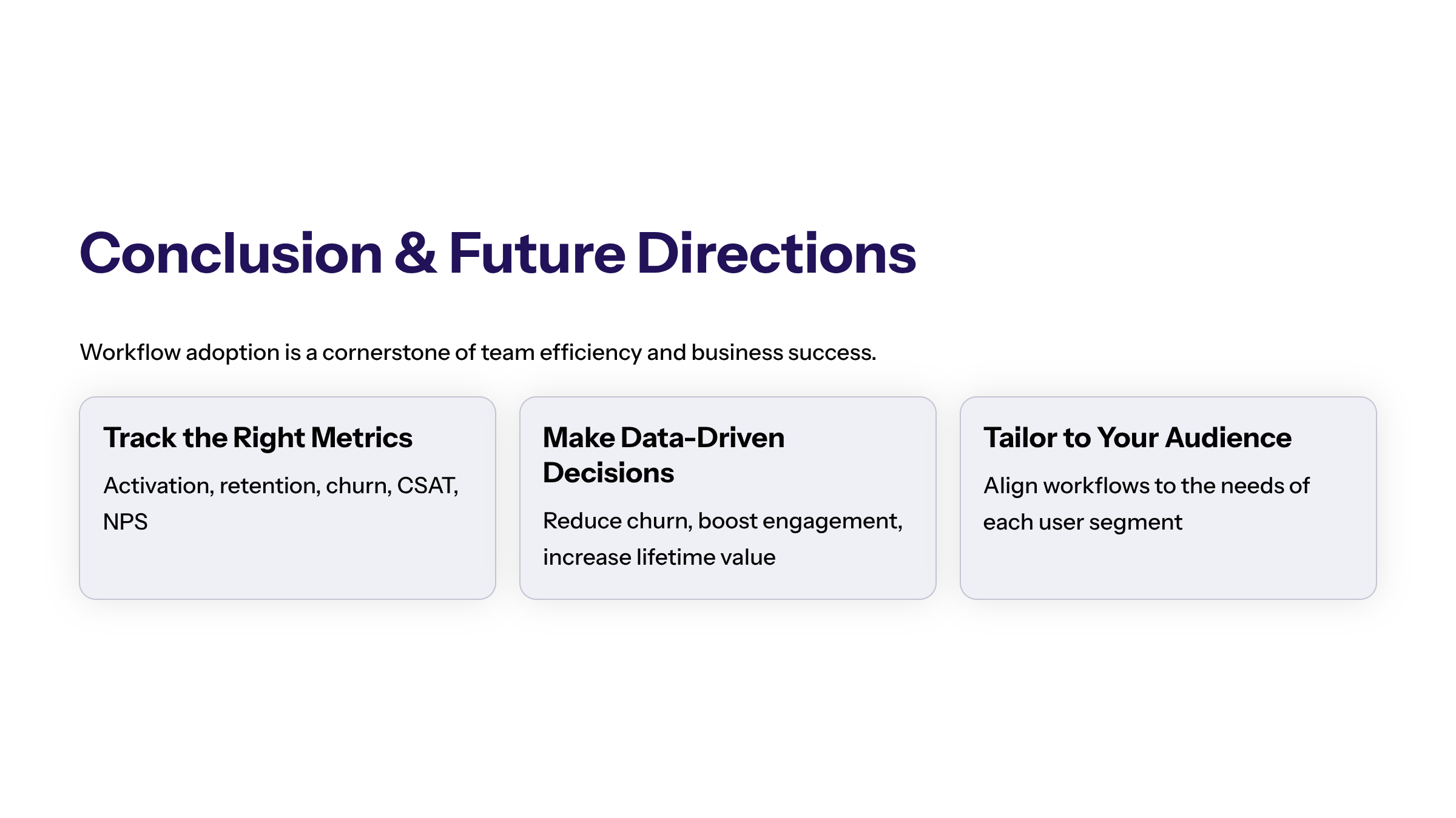 Selecting the right metrics to track is essential for gaining actionable insights into engagement and retention rates, helping teams tailor workflows to better meet the needs of their target audience. Moreover, effective workflow adoption supports customer acquisition by turning new users into satisfied customers who find ongoing value in the product.