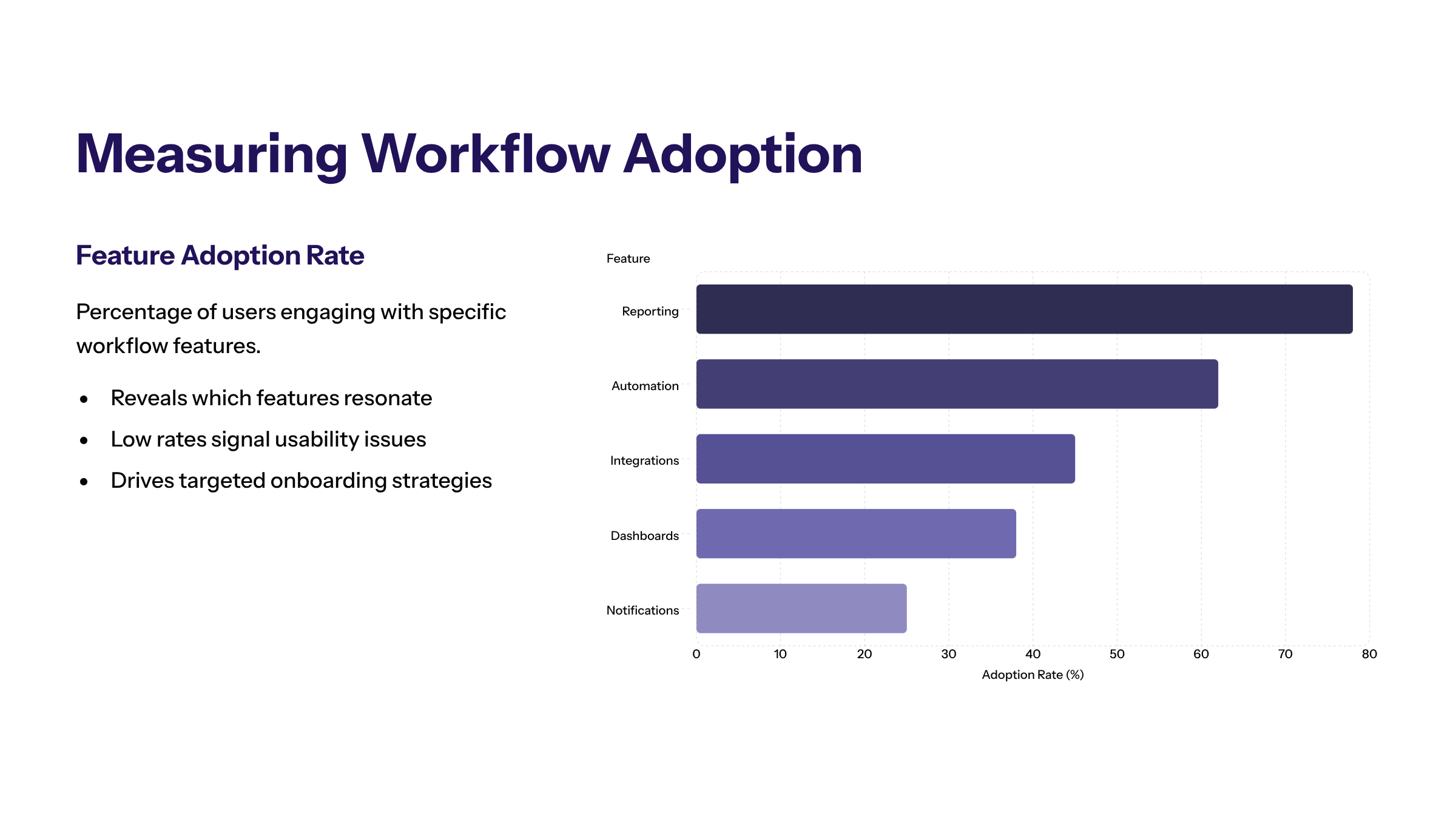 Feature adoption rate measures the percentage of users engaging with specific workflow features. It highlights which key features resonate with users and which may require enhancement or better communication.