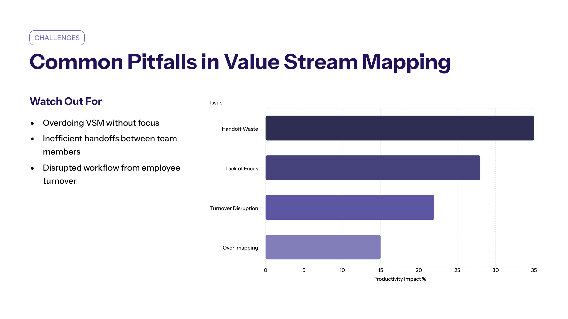 While value stream mapping is a powerful tool, it can be wasteful in itself if not done carefully. Overdoing value stream mapping or lacking focus can lead to problems such as inefficient handoffs between team members, which often occur when project ownership changes or there is employee turnover. These handoff wastes disrupt workflow and reduce productivity.