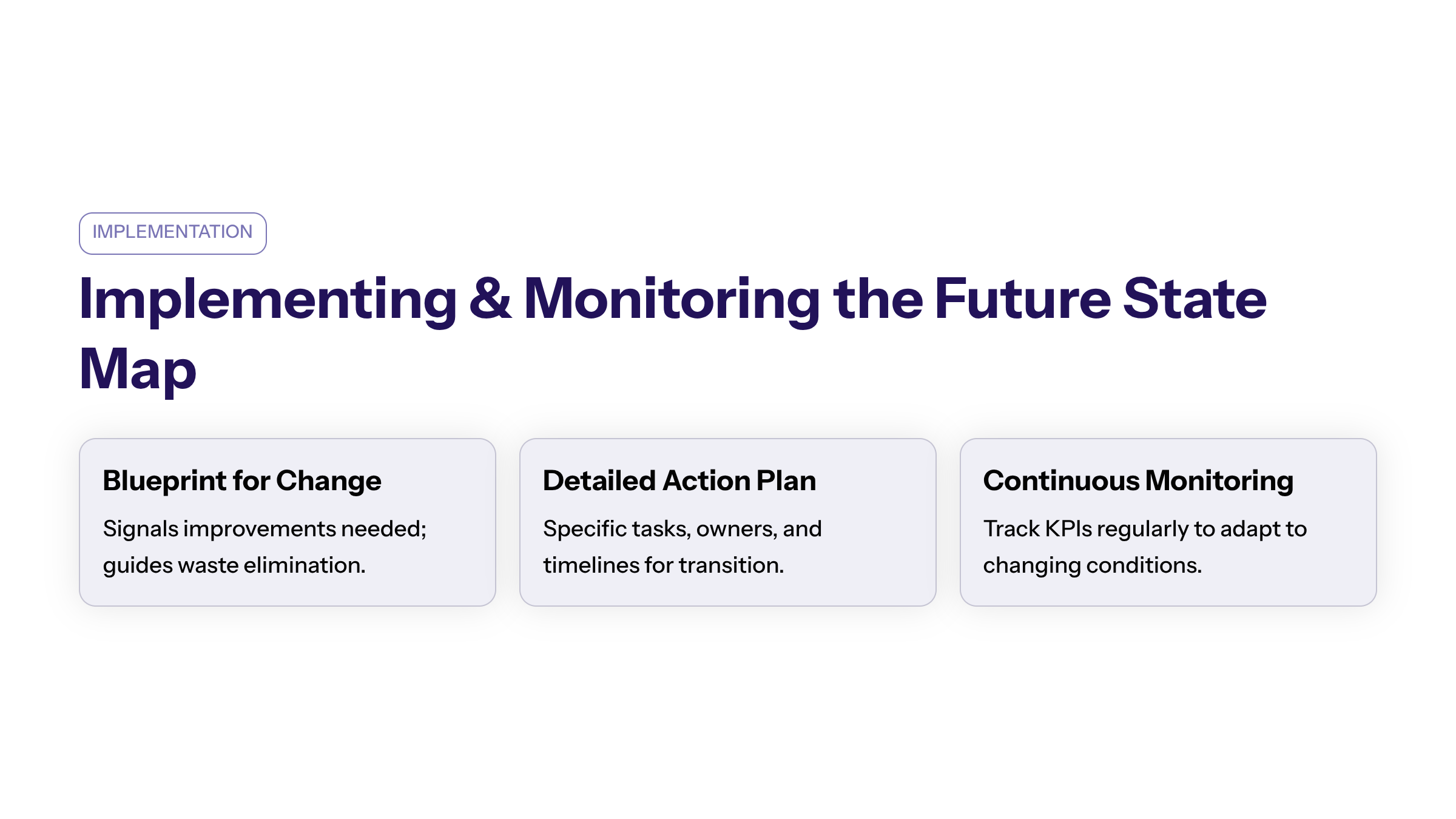 Creating a future state map signals improvements needed in the process and serves as a blueprint for eliminating waste and enhancing flow. Implementing the future map requires a detailed plan with specific tasks, owners, and timelines to transition from the current state to the future state.